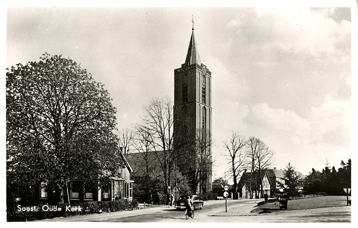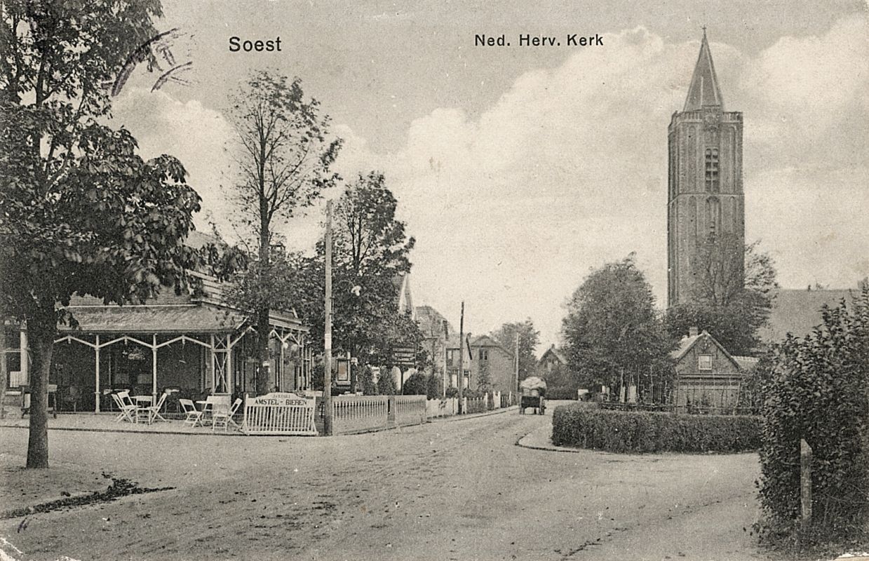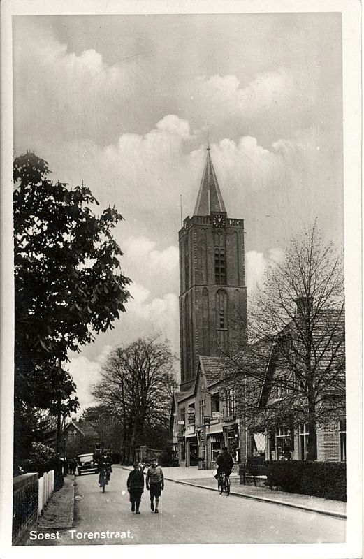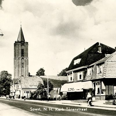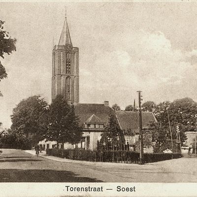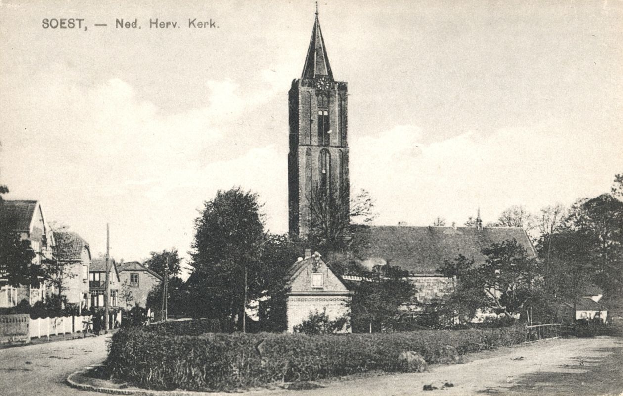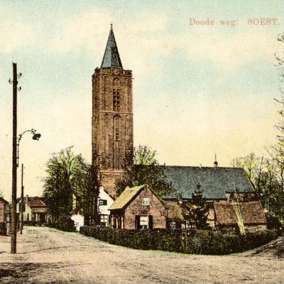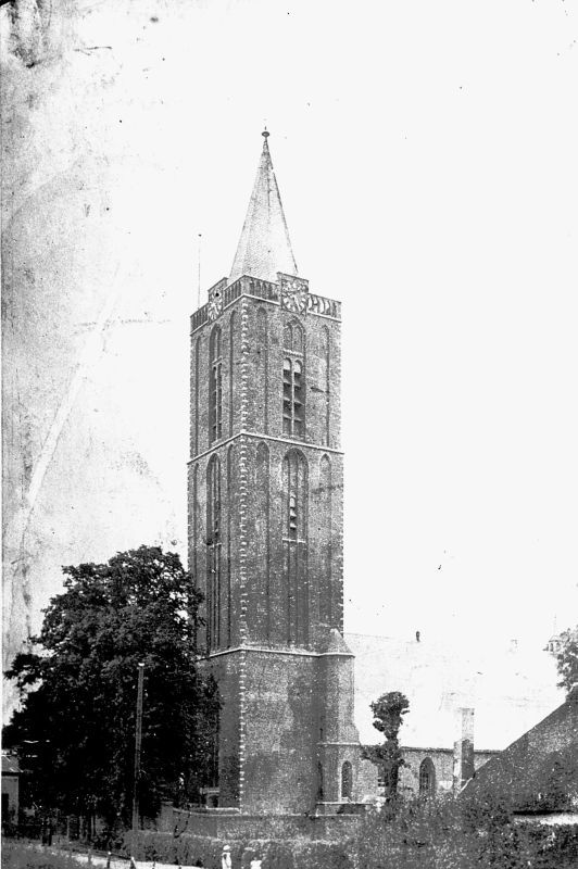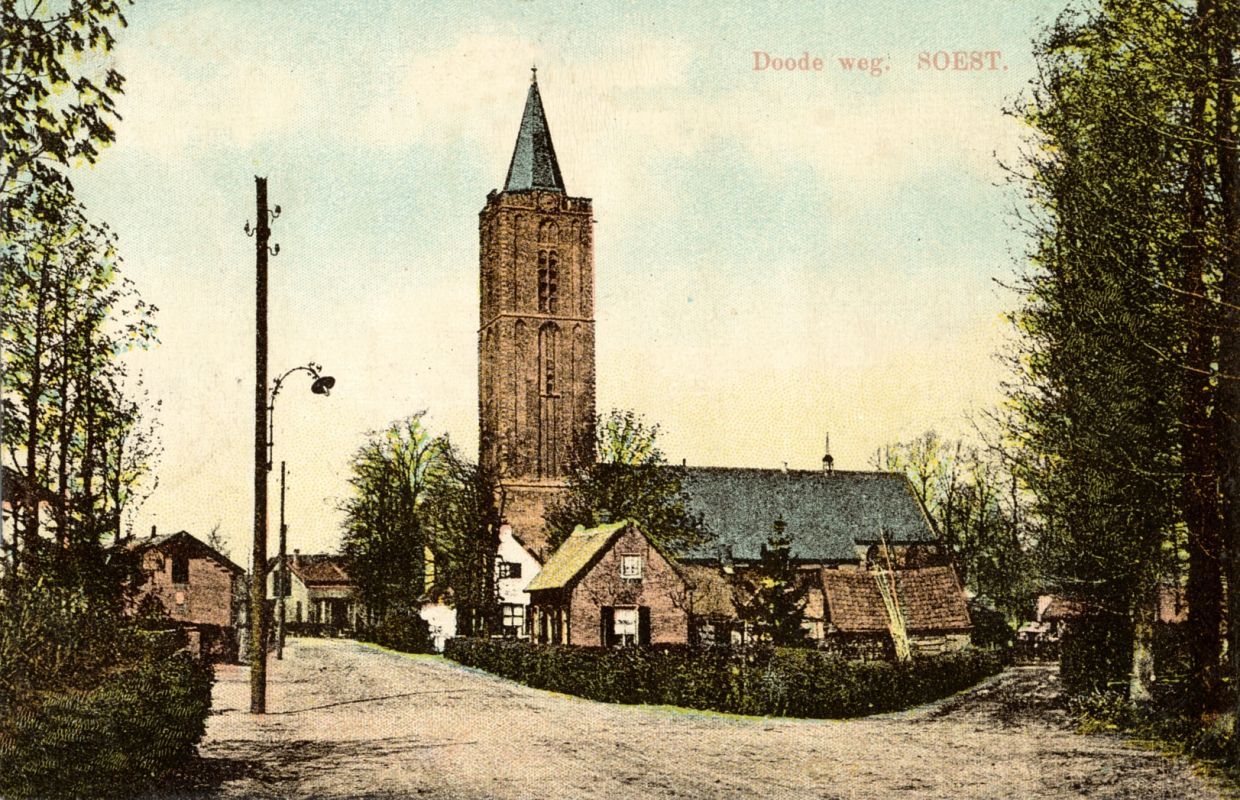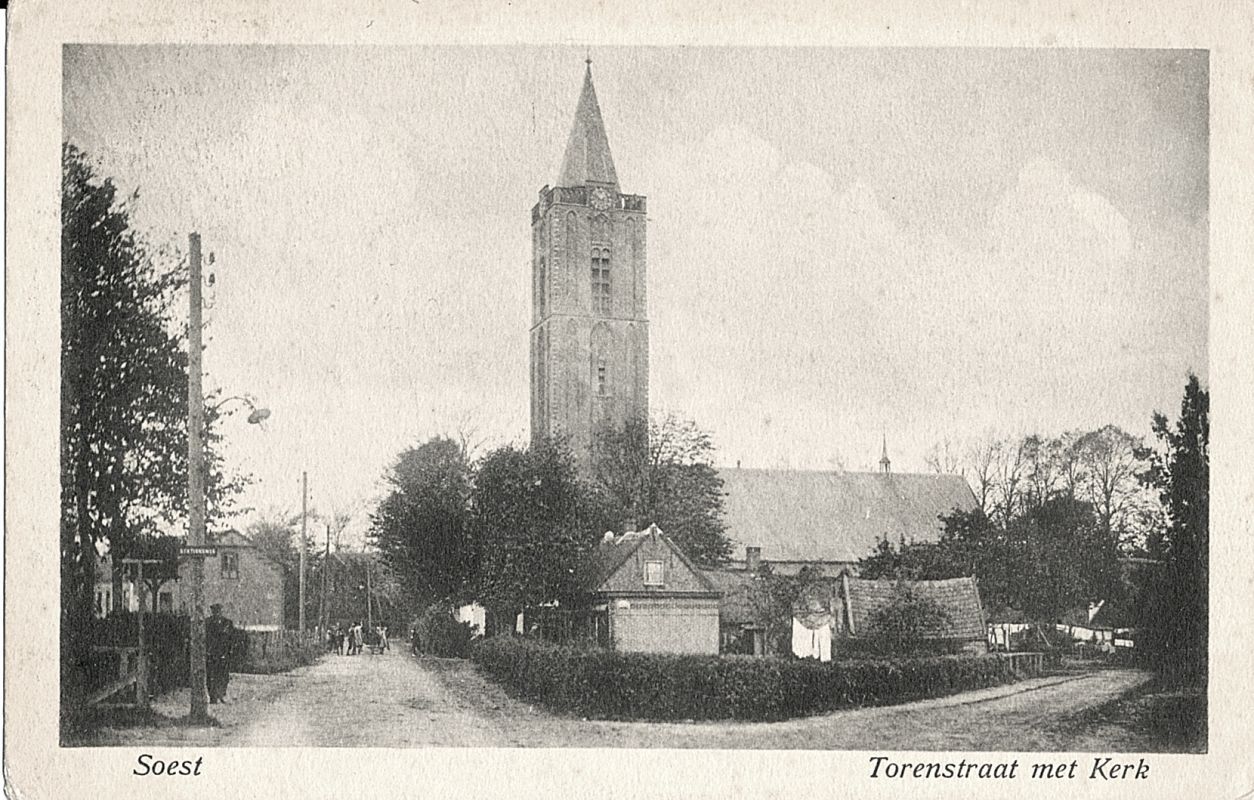 naar de toren van de Oude Kerk die rond 1482 is gebouwd nadat de kerk door een brand was getroffen bij een vergelding van de Hollanders nadat Soest en andere omliggende plaatsen een overval hadden gepleegd in Naarden.