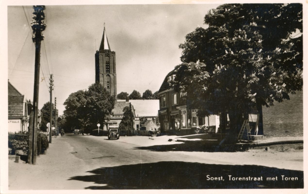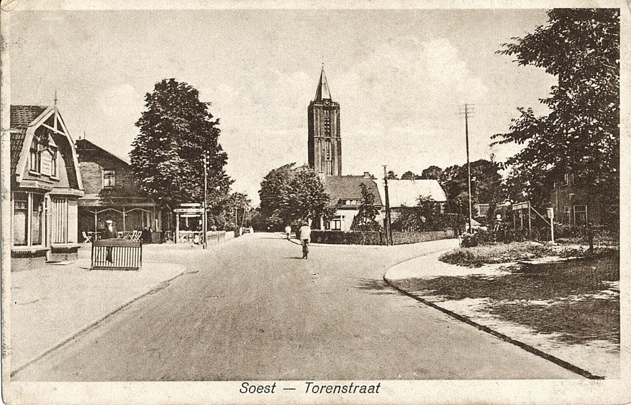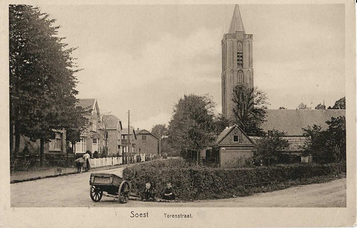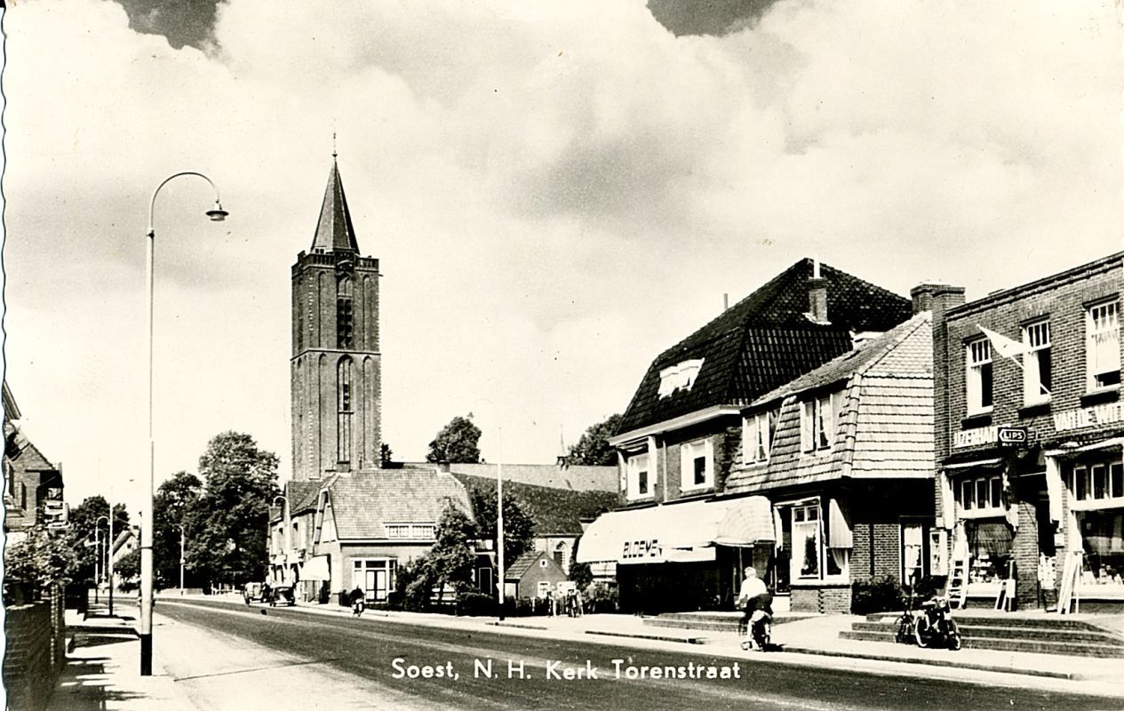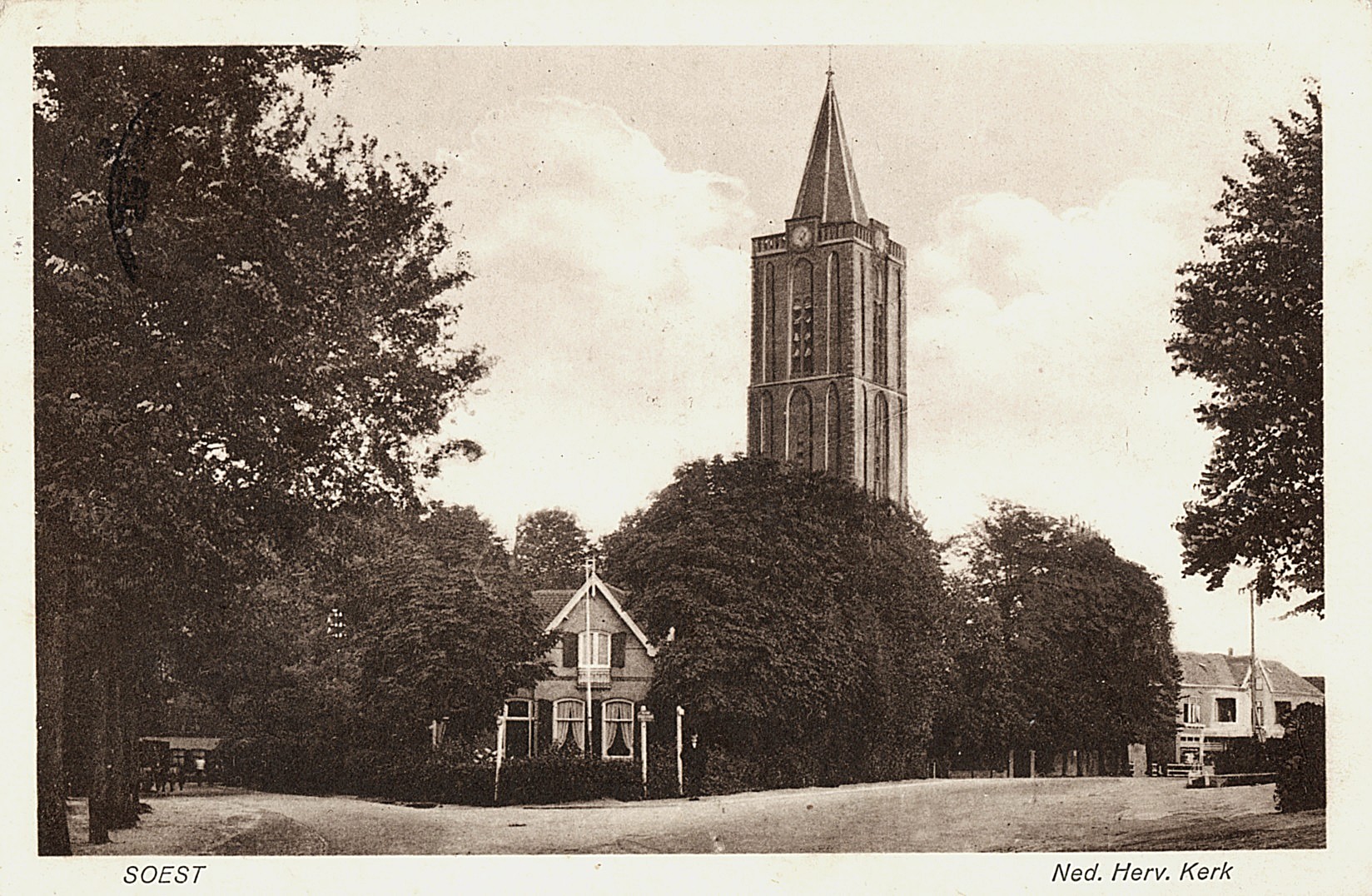 naar de toren van de Oude Kerk die rond 1482 is gebouwd nadat de kerk door een brand was getroffen bij een vergelding van de Hollanders nadat Soest en andere omliggende plaatsen een overval hadden gepleegd in Naarden.