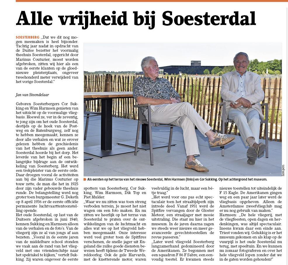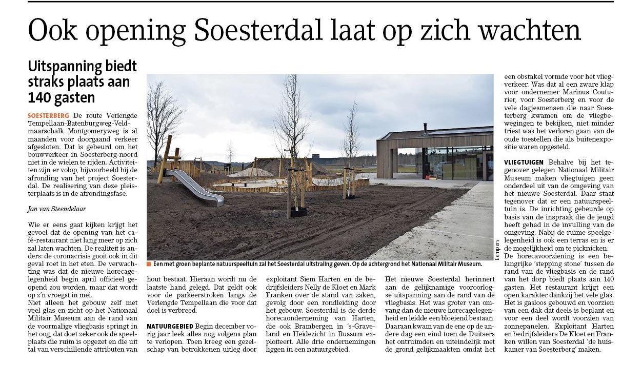 De start van dit Café-Restaurant was in een moeilijke periode. De corona zorgt voor uitstel van de geplande opening en legde de eerste tijd behoorlijk wat beperkingen op aan de exploitatie.Zie o.a. onderstaande berichten in de Soester Courant rondom de opening van Soesterdal (resp. gepubliceerd op 1 april 2020 en 6 juni 2020).