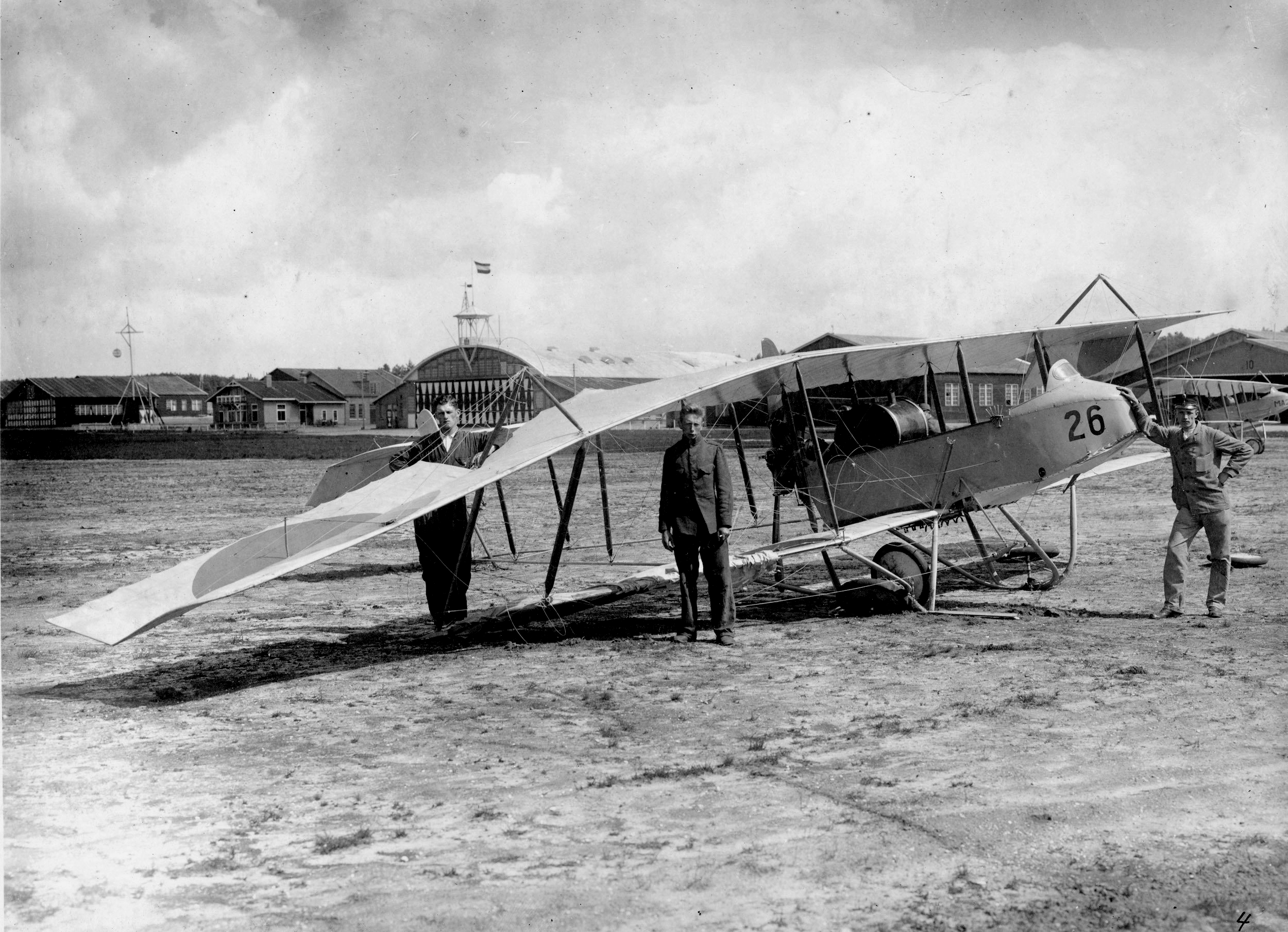 De beschadigde Farman LA 26 van Schlimmer als gevolg van een te lage bocht. Niet bekend wie de mannen op deze foto zijn. (foto MIMH)
