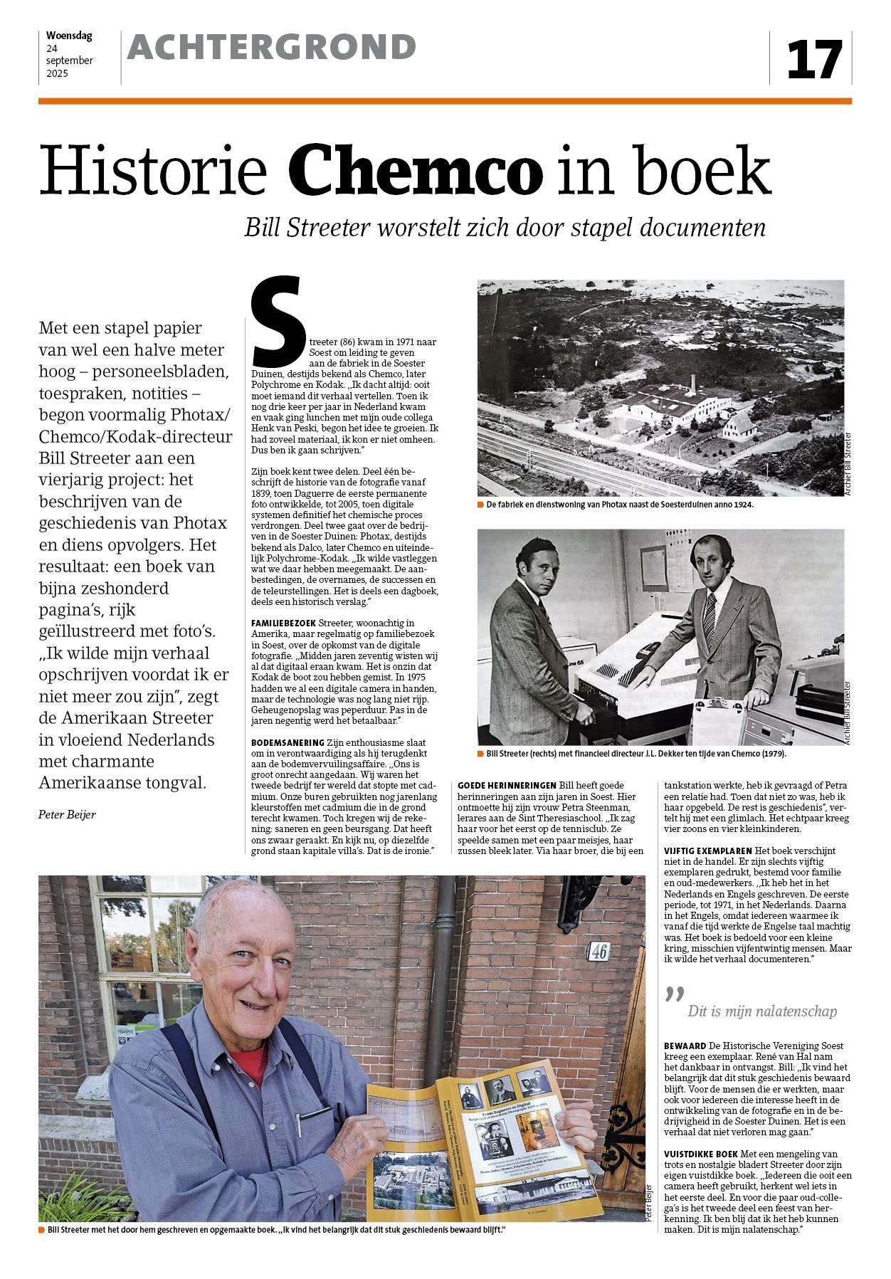 De heer W.J. Streeter, CEO Chemco in de periode 1971-1995 heeft afgelopen jaren gewerkt aan een boek waarin de historie van de fotografische industrie is opgenomen als ook de geschiedenis van de Fotografische Industrie in Soestduinen bekend onder de namen Photax, Dalco, Chemco en later Polychrome en Kodak.