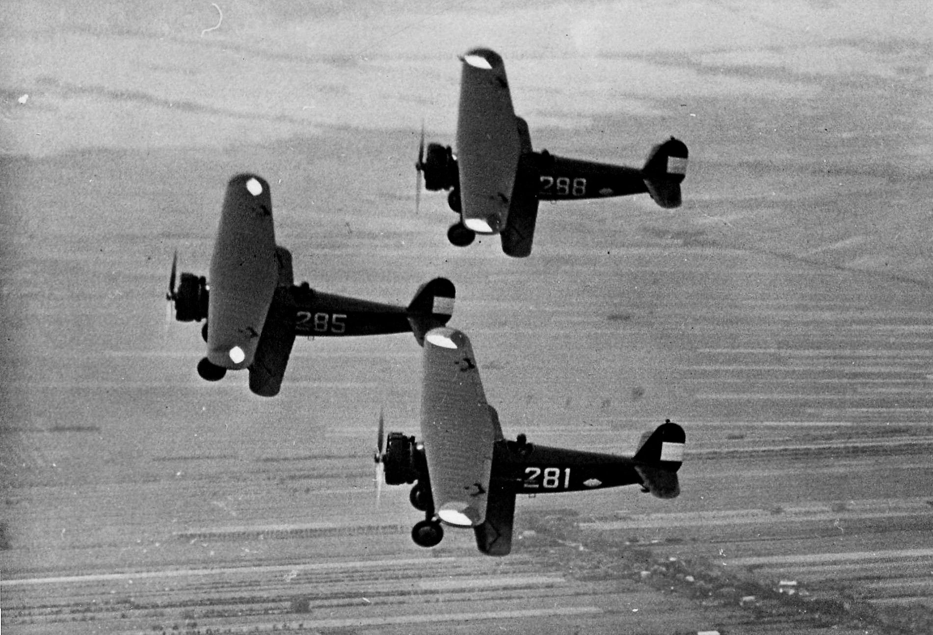Formatie van drie D.16’s - de nummers 281, 285 en 288. De gewichtjes die na de ‘proef’ van René boven op de rolroeren werden gemonteerd om deze dynamisch te stabiliseren zijn hier duidelijk te zien. (foto: Peter Alting)