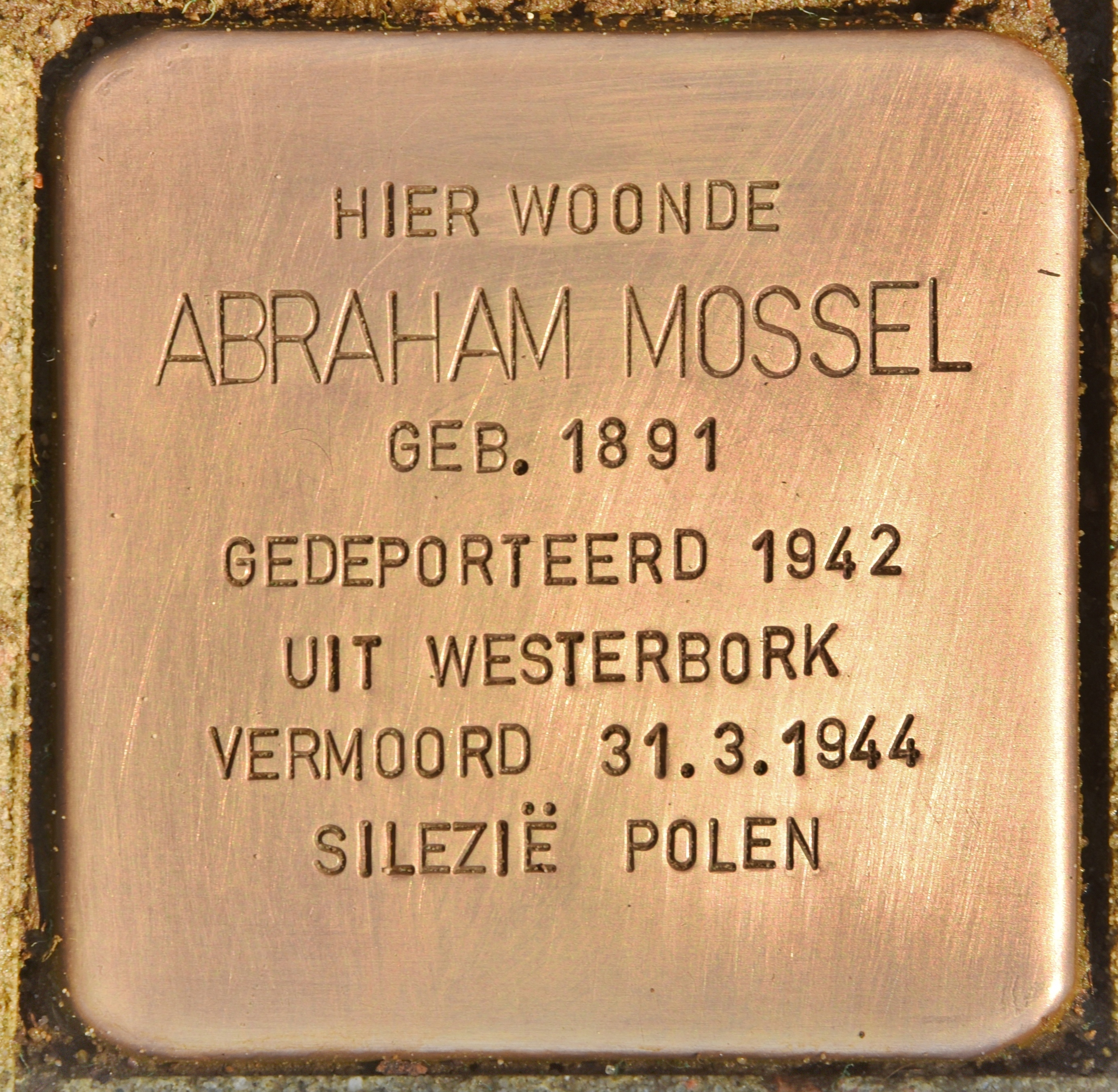 HIER WOONDE ABRAHAM MOSSEL GEB. 1891 GEDEPORTEERD 1942 UIT WESTERBORK VERMOORD 31.3.1944 SILEZIË POLEN |
