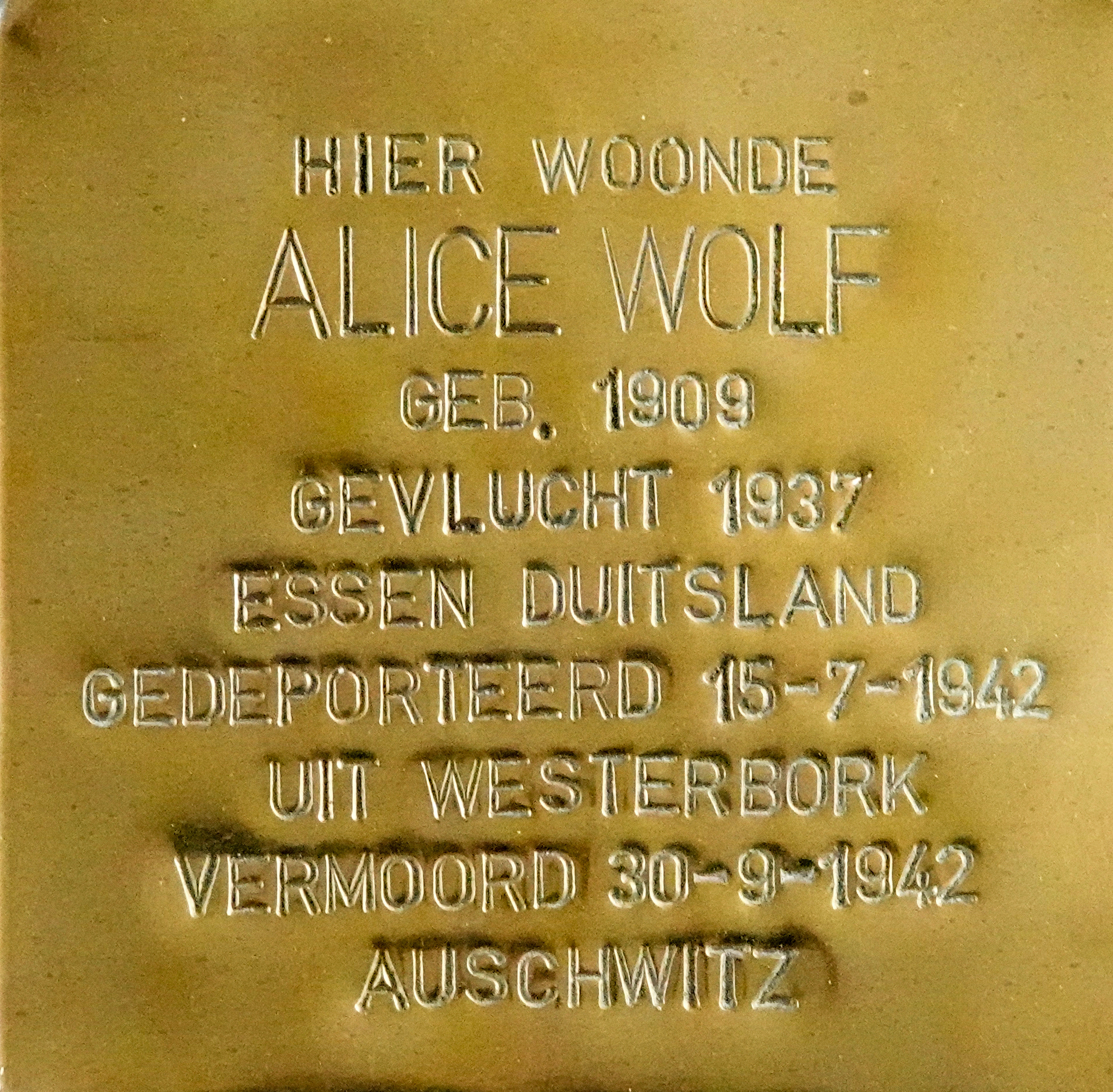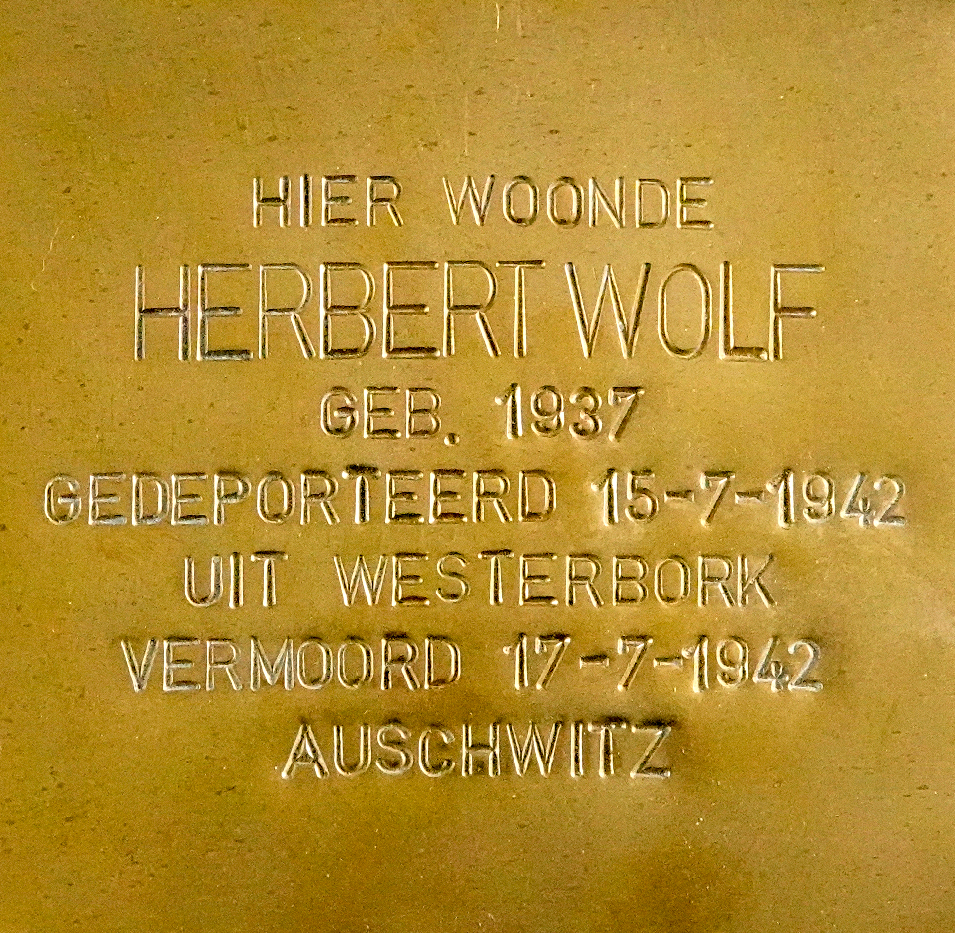 HIER WOONDE HERBERT WOLF GEB. 1937 GEDEPORTEERD 15-7-1942 UIT WESTERBORK VERMOORD 17-7--1942 AUSCHWITZ |