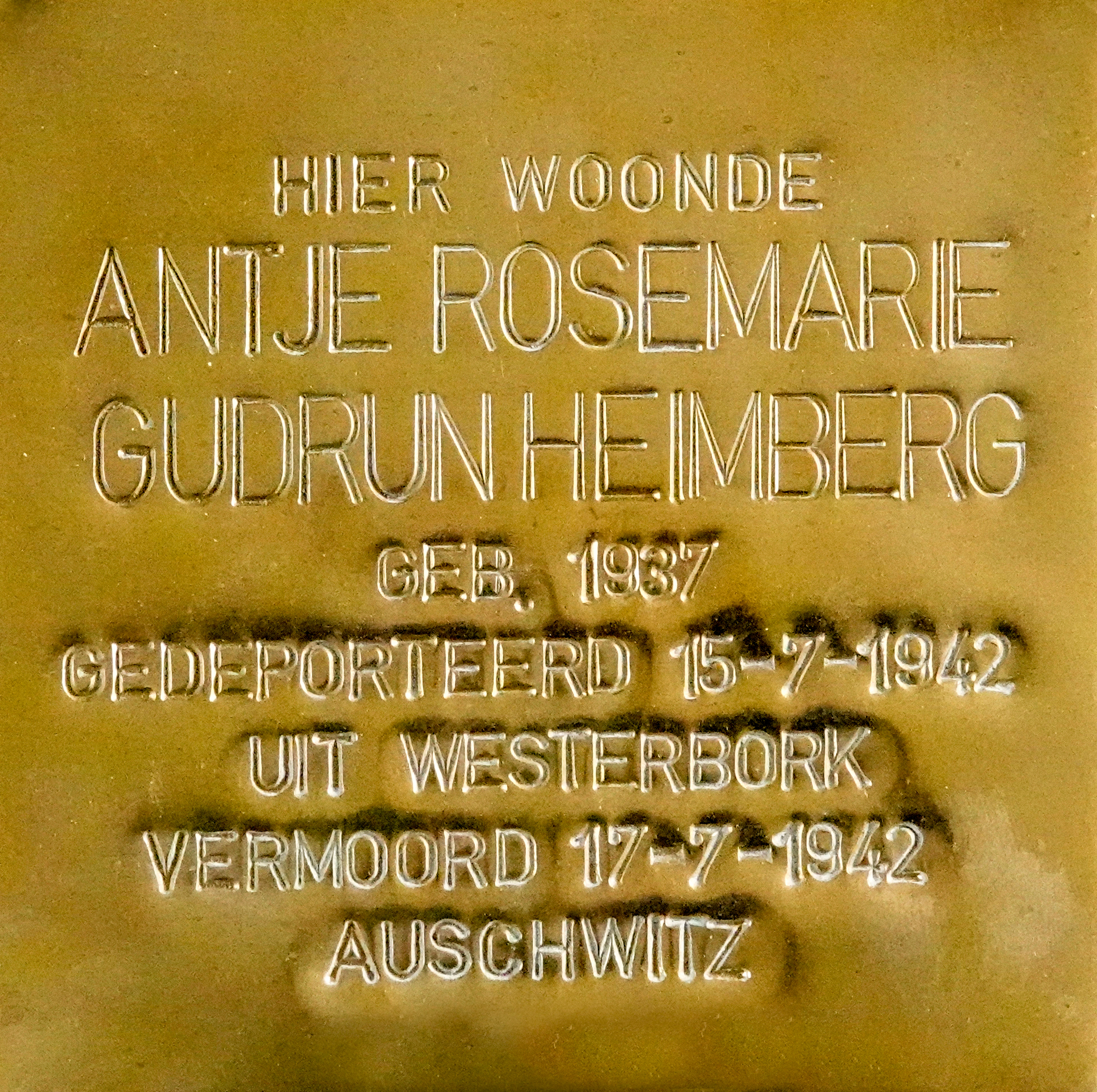 HIER WOONDE ANTJE ROSEMARIE GUDRUN HEIMBERG GEB. 1937 GEDEPORTEERD 15-7-1942 UIT WESTERBORK VERMOORD 17-7--1942 AUSCHWITZ |
