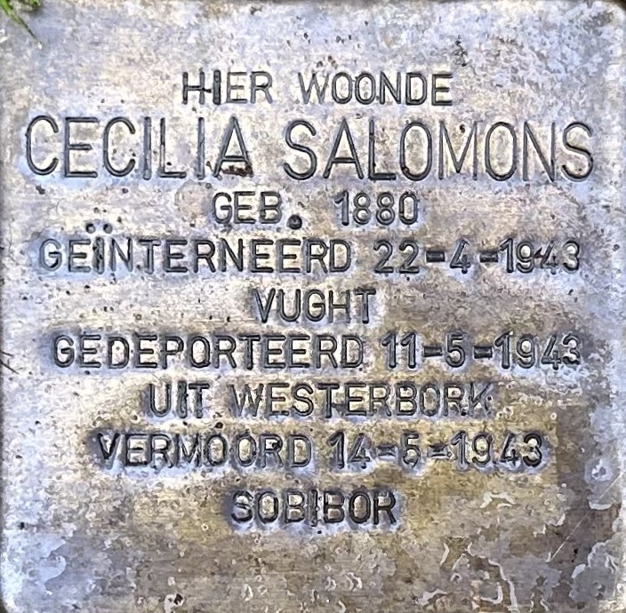 HIER WOONDE CECILIA SALOMONS GEB. 1880 GEÏNTERNEERD 22-4-1943 VUGHT GEDEPORTEERD 11-5-1943 UIT WESTERBORK VERMOORD 14-5-1943 SOBIBOR |