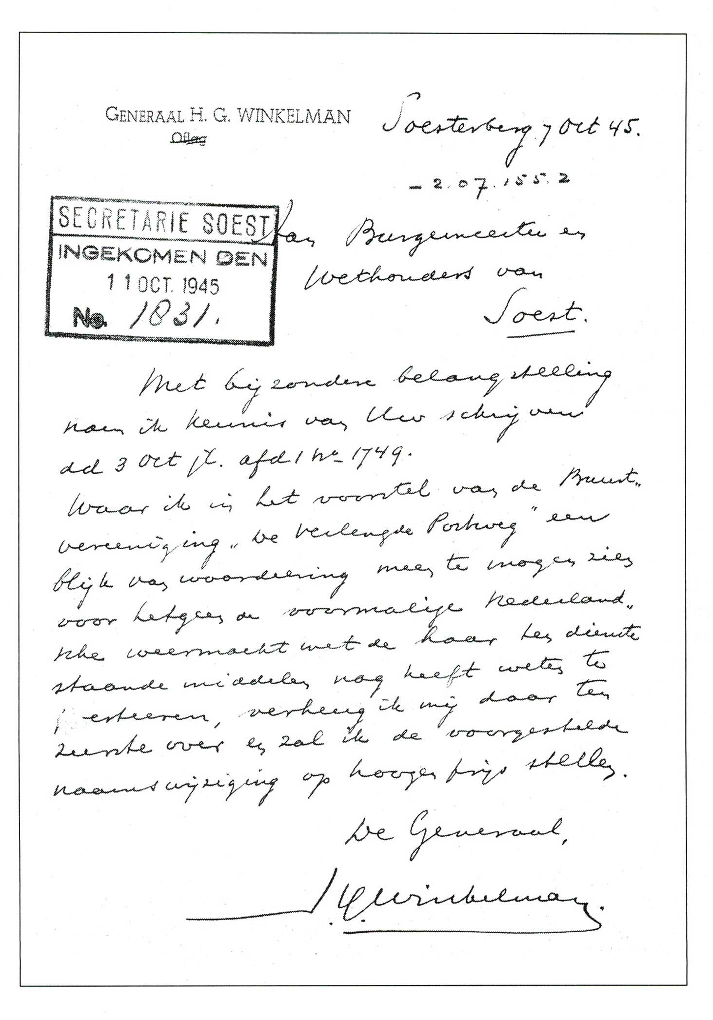 Op 4 oktober 1945 zonden B&W van Soest een schrijven naar generaal Winkelman met de volgende inhoud: "Hierbij deden wij Uwe Excellentie mede, dat de Buurtvereeniging "de Verlengde Postweg" te Soesterberg ons verzocht heeft de benoeming van den Verlengde Postweg te uwer eere te wijzigen in Generaal Winkelmanweg. Gaarne zullen wij daartoe onze medewerking verleenen, doch alvorens daartoe over te gaan, zouden wij het zeer op prijs stellen van u te mogen vernemen of u zich hiermede kunt vereenigen".
