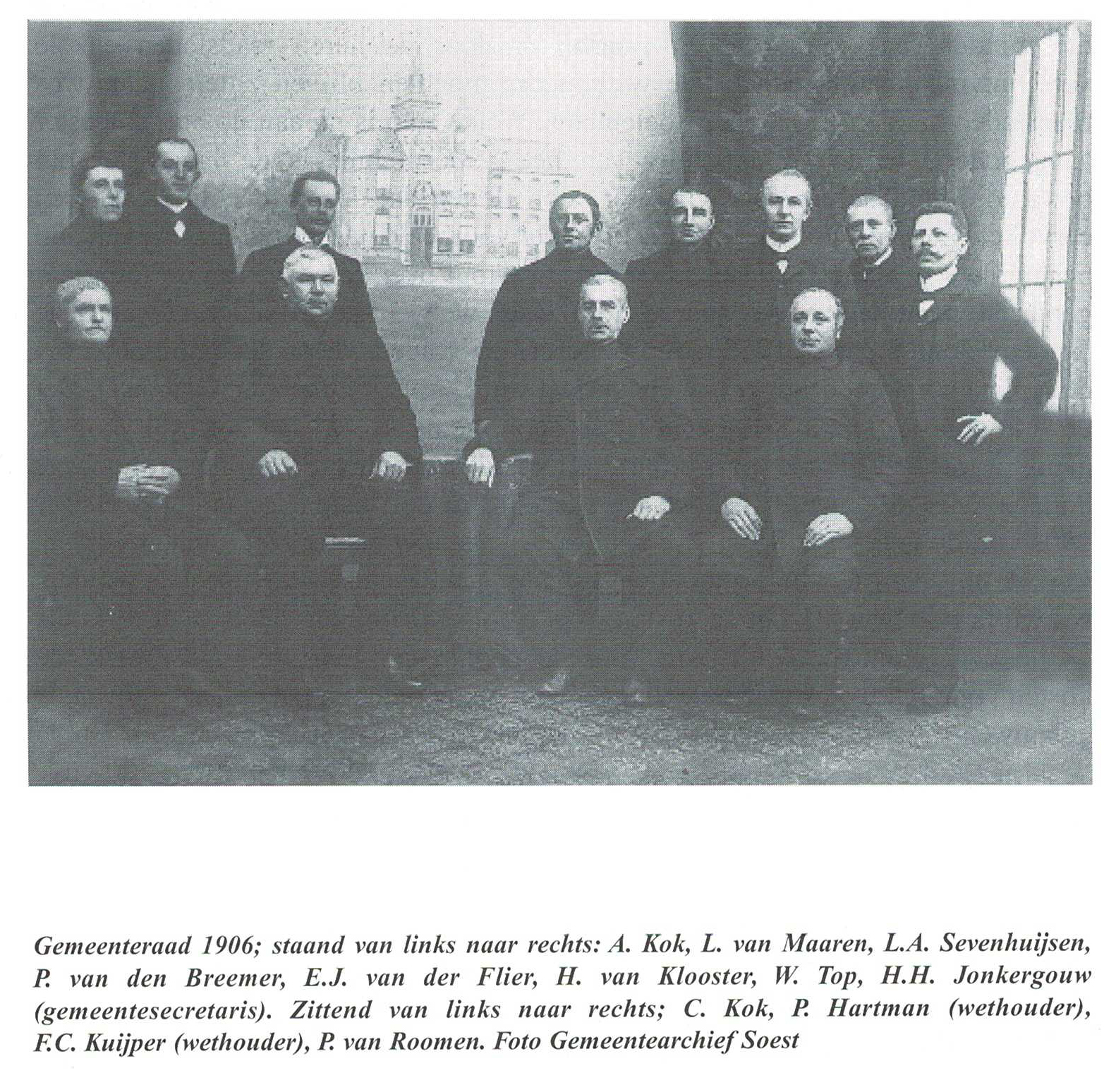 Als u dit leest zijn de gemeenteraadsverkiezingen alweer voorbij en zal binnenkort de nieuwe gemeenteraad beëdigd worden [1]. Ongetwijfeld zal er ook een groepsfoto gemaakt worden waarop tegenwoordig zelfs 29 raadsleden poseren. Dit is een wereld van verschil met de gemeenteraad van precies 100 jaar geleden. Ook toen heeft dit gezelschap zich laten vereeuwigen, er staan twaalf mensen op de foto uit 1906: elf raadsleden en de gemeentesecretaris. U zult opmerken dat de burgemeester niet op de foto staat en dat was niet omdat de burgemeester vertrokken was. Integendeel, hij vierde zijn jubileum van 25 jaar burgemeester van de gemeente Soest en bleef daarna nog acht jaar onze burgervader [2]. De gemeenteraad had voor deze speciale gelegenheid een foto van zichzelf laten maken voor een tekening van het toenmalige gemeentehuis en deze aan de jubilaris aangeboden. Ook kreeg burgemeesterMr.C.J.W. Loten van Doelen Grothe een geschilderd portret van hem zelf.