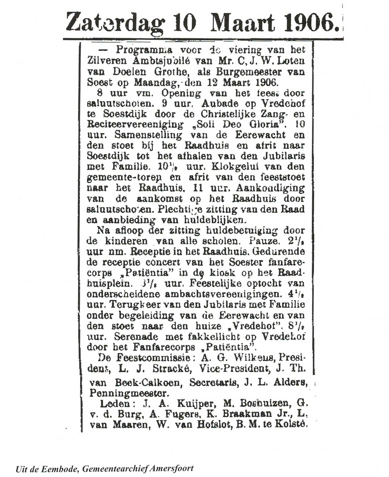 Toch heb ik een andere bron kunnen vinden en wel de krant "De Eembode". In een bijvoegsel van zaterdag 17 maart 1906 wordt verslag gedaan van het jubileumfeest [9]. Een week eerder had de feestcommissie al het programma gepubliceerd in deze krant en zodoende weten we wie de commissieleden zijn: A. G.Wilkens,president, L.J Stracké, vice-president, J.Th. van Beek-Calkoen, secretaris, JL. Alders,penningmeester, JA. Kuijper (geen familie van wethouder Kuijper), M Boshuizen, G.v.d. Burg, A. Fugers, K Braakman Jr.,L. van Maaren, W van Hofslot (schoonzoon van wethouder Kuijper), B.M te Kolsté. In de Eembode van de daarop volgende week lezen we dat dhr.Wilkens namens de ingezetenen een electrische lantaarn, ofschoon nog niet gereed, aan de jubilaris aanbiedt. Om niet met lege handen iets aan te bieden kwam Wilkens met het beeld van den lantaarn, vervaardigd door den kunstschilder Stracke.