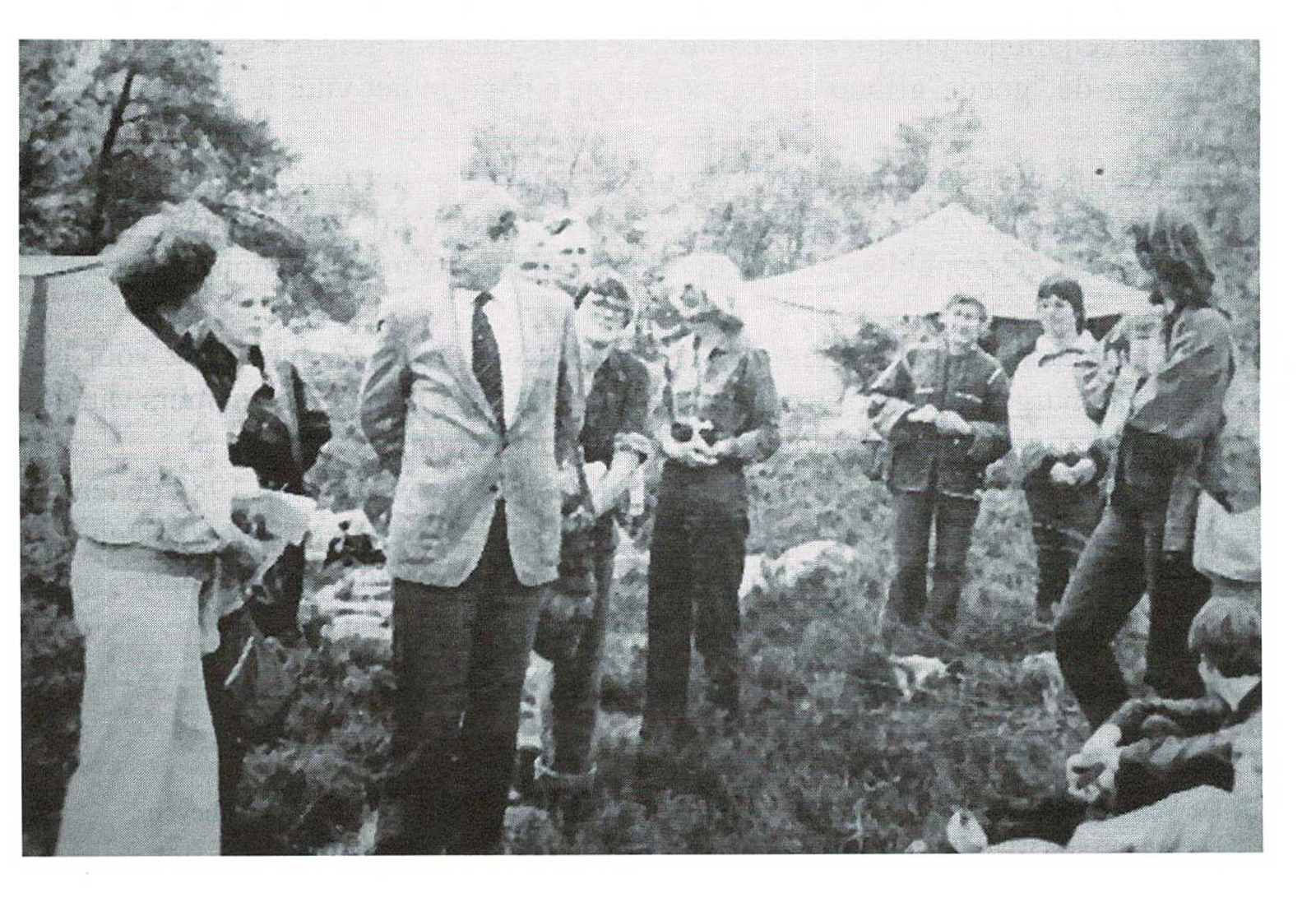 Op de hieronder geplaatste foto brengt burgemeester Scholten op 26 mei 1982 een bezoek aan het kamp. Hij komt de deelneemsters het besluit van burgemeester en wethouders — het besluit, dat na een extra vergadering van de raadscommissie Algemene Bestuurszaken was geformuleerd - mededelen.