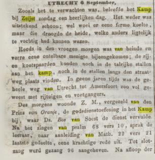 Wat is het toch, dat pastoor Steenhoff zo aantrok in het Kamp bij Soesterberg? Bovendien is dat Kamp in 1853 gelegen binnen de vastgestelde grenzen van de parochie Soesterberg (zie daartoe deel 12). Wie de krant uit die dagen, t.w. augustus en september 1853 erop naslaat komt snel tot de conclusie, dat "Het Kamp bij Zeijst" in het brandpunt van de (landelijke) belangstelling staat. De Utrechtse Courant 2) bijvoorbeeld van 7 september 1853 bericht als volgt: