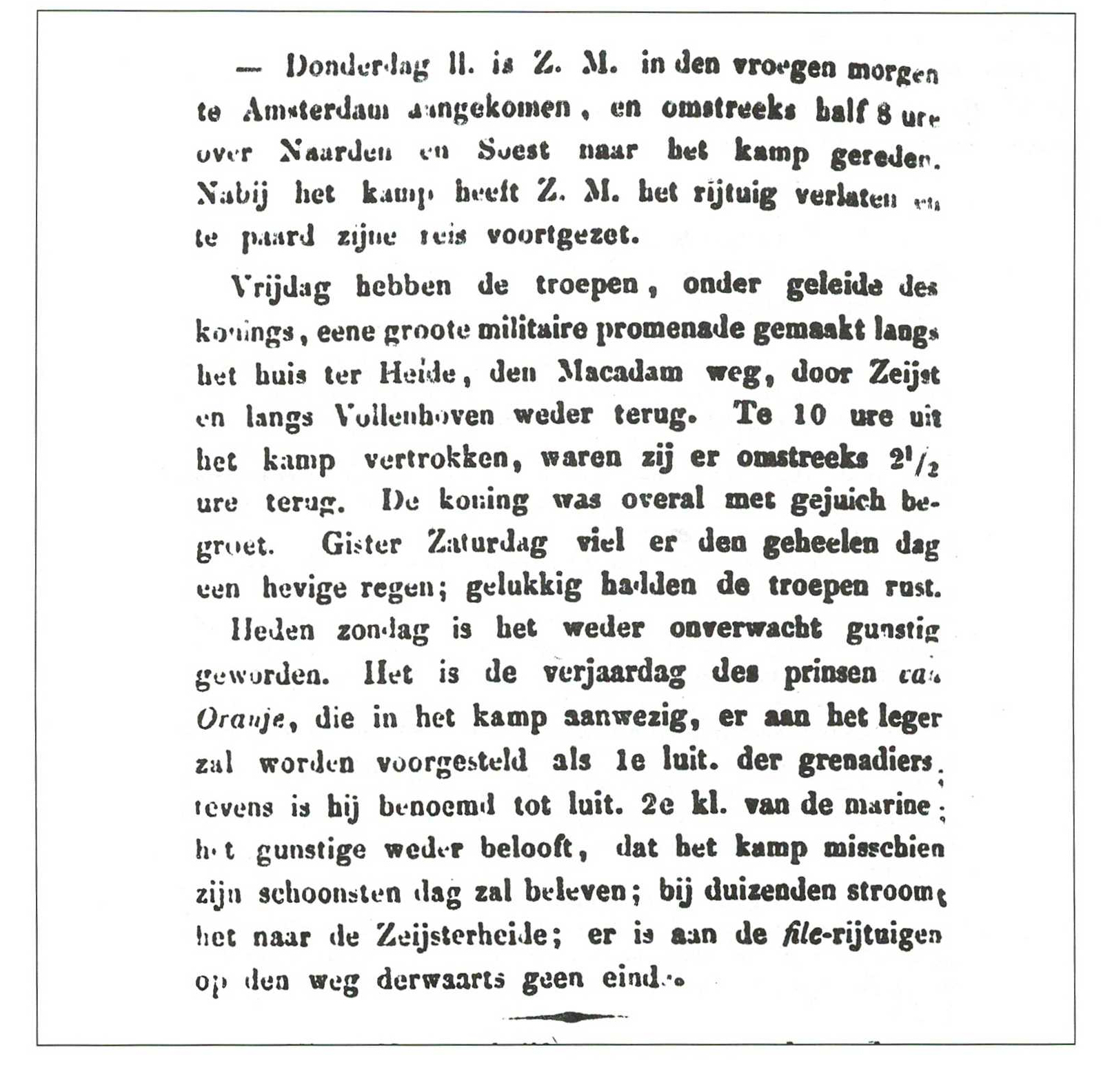 "Z(ijne) M(ajesteit) wilde reeds aan tafel zijne afwezigheid afkeuren, door zich met Dominé Bos druk te onderhouden, zonder pastoor Steenhoff een eenkel woord toe te voegen, maar in plaats daarvan van tijd tot tijd eenen grimmigen blik, volgens getuigenis van past. Steenhoff zelfs op den pastoor te werpen. Hadde den Oud-professor dit nu maar als een teeken aangezien en opgenomen om zich na de tafel spoedig uit de voeten te maken, maar men behoort bij de wetenschappen vooral ook de ondervinding en menschenkennis te bezitten. Pastoor (Steenhoff) ging niet spoedig heen, bleef tot den laatste toe en wilde Z.M. afzonderlijk nog met de gebeurtenis van dien dag feliciteeren, waarop Z.M. hem al daadelijk niet innemend vraagde: Wie zijt gij? als wilde de konig vragen: Hoe hebt gij hier ongenoodigd durven komen en op het antwoord wie zijt gij, met nog forscher stem wie zijt gij? als wilde de koning vragen in welke kwaliteit zijt gij hier gekomen. Als nu de pastoor van zich had kunnen verkrijgen om te zeggen: Ik heb voor den pastoor van Soesterberg heden morgen de godsdienstoefening hier in het Kamp gehouden en meende in zijne plaats ter Uwer Majesteit maaltijd te mogen komen, dan had alles waarschijnlijk wel afgeloopen; maar toen past. Steenhoff begon te zeggen, dat hij te Rome gestudeerd had en professor te Warmond geweest was, scheen Z.M al het voorgaande om een dienstdoenden priester voor het Kamp te verkrijgen, zich te herinneren, en werd volgens de verzekering van pastoor Steenhoff, zoo kwaad, dat hij op zijnen degen sloeg, als wilde Z.M. den pastoor bedreigen. Zoodat ik aan anderen overlaat te oordeelen aan welke zijde het regt ware". [1]