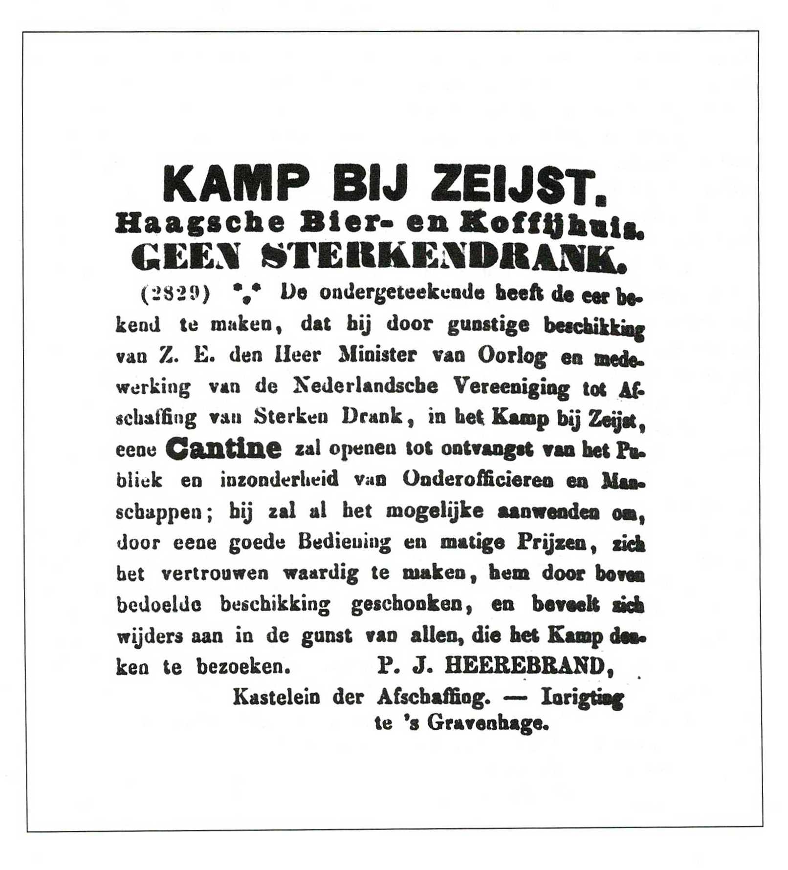 Behalve de generaal trekt ook de zoals de bekendmaking in de minister van oorlog ten strijde tegen de Utrechtsche Courant [2] van 12 augustus sterke drank in het kamp bij Zeijst, 1853: