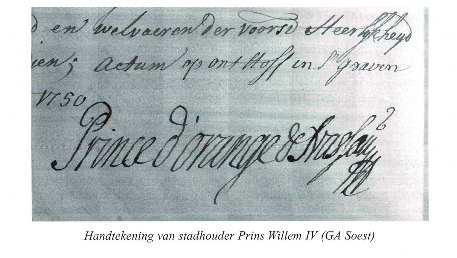 Een nieuwe stadhouder In 1747 werd Willem IV door de Staten van Utrecht benoemd tot stadhouder over het gewest. Van schout en gerecht van Soest ontving hij de volgende felicitatie: "Ende deweyle God Almagtig behaagt heeft de gebeeden van zyn volk en ons mitsgaders t geroep van Neerlands inwoonderen te verhooren en zijn Doorlugtige Hoogheyd den Heere Prinse van Oranje en Nassauw etc etc etconsen Ambagtsheer te verheffen tot Stadhouder Capitain en Admiraal Generaal van de geunieerde Provintien soo hebben wij schout en geregten het ook van onsen pligt geagt zijn Doorlugtige Hoogheyd onsen ambagtsheer daaroverbydeese te feliciteeren en onsen harten vreugt over die verheffinge te betuygen zijn doorlugtige Hoogheyd in deese swaarwigtige amtsbedieninge toewenschende wat zijn doorlugtige Hoogheyd daartoe na lighaam en Geest nodig heeft. [2]