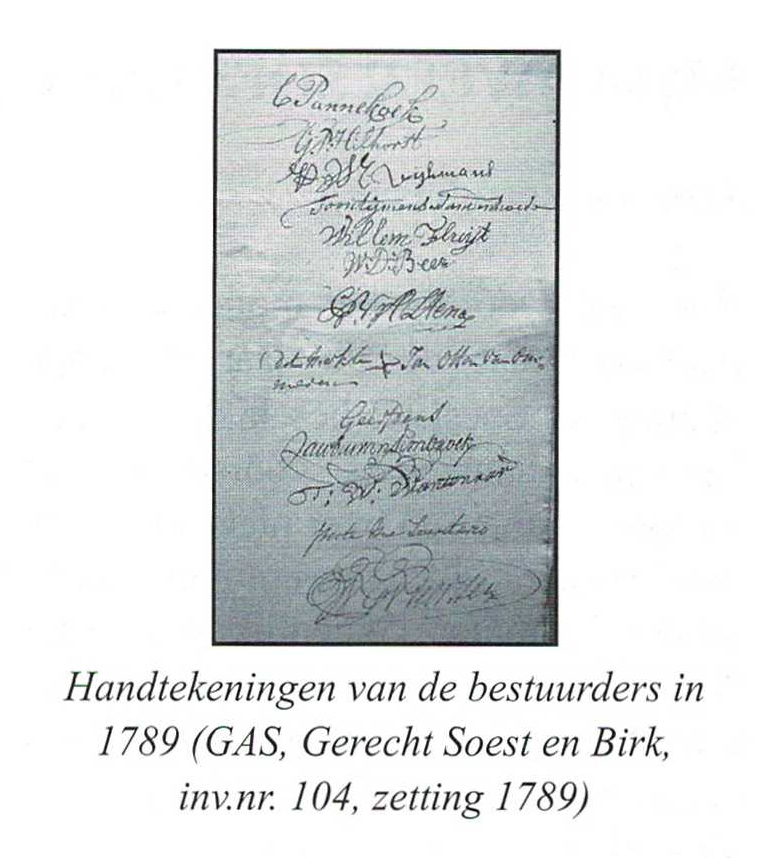 Wanneer we de namen van de buurmeesters en schepenen van Soest van de eerste jaren na 1787 op een rij zetten valt net als in de jaren daarvoor vooral de continuïteit op. De meesten die aan het eind van de jaren '80 in functie waren, zaten al sinds jaar en dag in het dorpsbestuur. Dat gold voor Toon Thijmense van der Hoef [16], Pieter Migielse Dijkman, Cornelis van Altena, JanOftenvan Ommeren (schepen voor Hees), Willem Fluijt, Wilhelmus de Beer en Willem Smits. De enige die uit het dorpsbestuur verdween, was Wilhelmus de Beer (1731-1800). Hij had sinds 1769 altijd een ambt als schepen of buurmeester bekleed, maar werd na 1788 niet herbenoemd. De reden waarom hij van het bestuurlijke toneel verdween, is niet bekend.