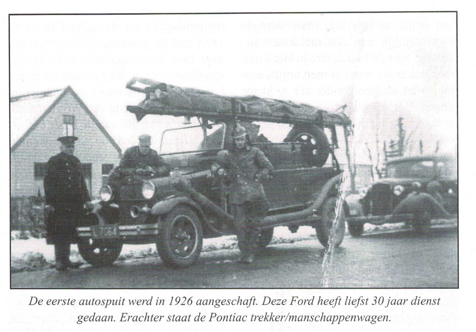 In het begin veranderde er nog niet veel. De eerste (tot 1855) handgetrokken en —bediende brandspuit was weliswaar vervangen door een motor-plunjerpomp met een capaciteit van 500 liter per minuut, maar hij werd de eerste drie jaar nog wel getrokken door een paard. Het dier was niet zelden moeilijk te vangen, wat de uitruktijd aanmerkelijk verlengde... In 1926 werd het eerste voertuig aangeschaft dat men met enige fantasie een heuse brandweerauto zou kunnen noemen. In de jaren die volgden werden de middelen ter voorkoming en bestrijding van brand en brandgevaar —mede door de aanleg en uitbreiding van het waterleidingnet- steeds beter, zoals het rijdende materieel en de slangen. Het oefenen door de vrijwillige brandweerlieden, die ook toen al hun taak zeer serieus opvatten, en ook het systeem van alarmeren werd verbeterd. De kleppers waren al vervangen door het bij brand luiden van de klokken in de toren van de Oude Kerk, en later door een sirene op het raadhuis annex politiebureau aan de Steenhoffstraat. Ook telefonische alarmering werd mogelijk; later kwamen er de persoonlijke alarmeringsmiddelen, zoals de pagers (piepers) waarover iedere vrijwilliger nu de beschikking heeft.