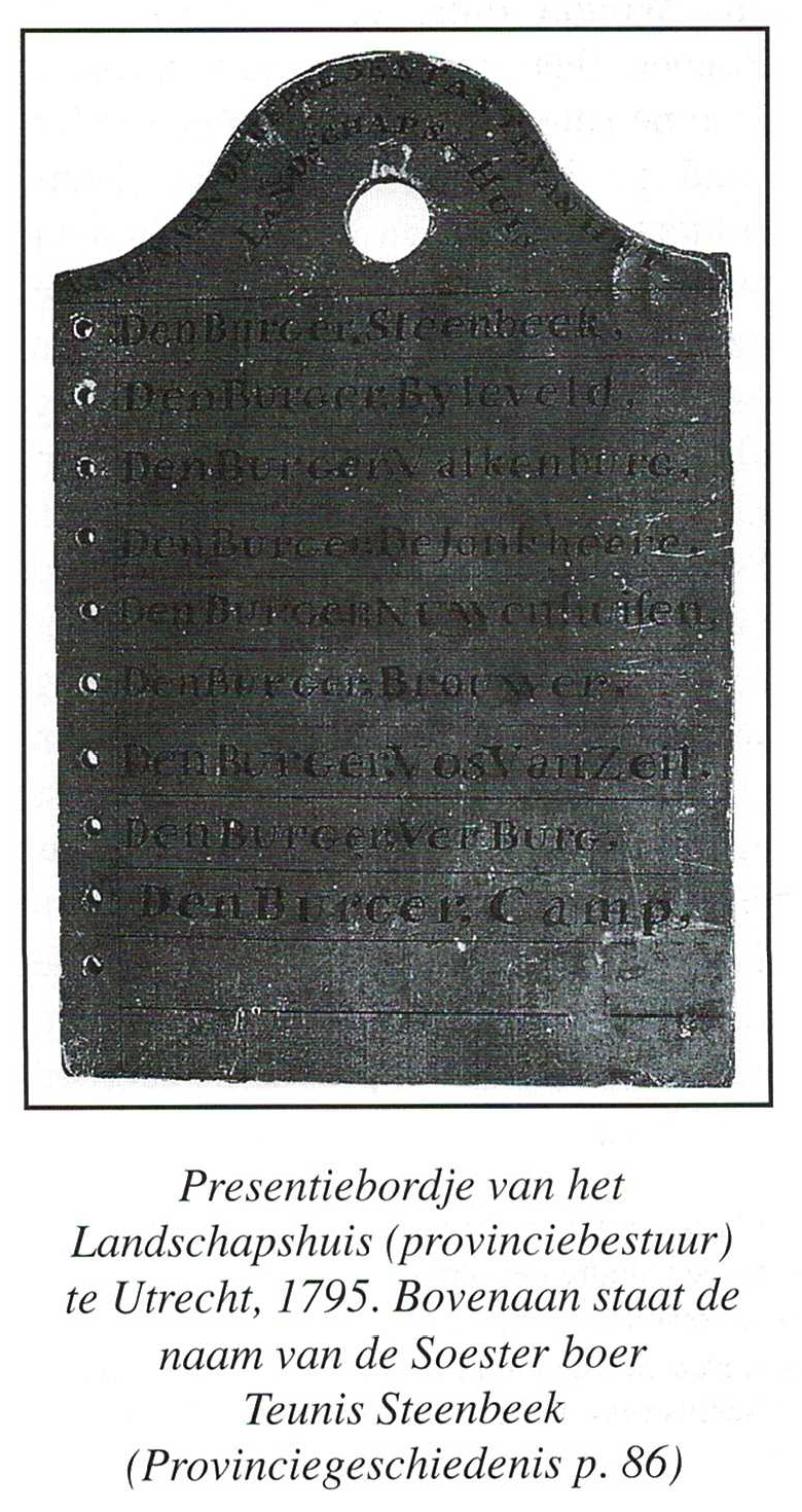 [9] GA Soest, Gerecht Soest en Birk(1588- 1813), inv.nr. 19, 15 februari 1795. Of de Soestenaren inderdaad samen met de vertegenwoordigers van Baarn naar Utrecht zijn gegaan of elkaar daar getroffen hebben, is de vraag. Het bestuur van Baarn stuurde namelijk een brief naar Soest met het verzoek om de uitslag van het bezoek aan de Statenvergadering door te geven en kopieën van papieren te mogen ontvangen. In elk geval besloten de Soesters toen om 'met die van Baarn en ter Eem communicatief te gaan'.