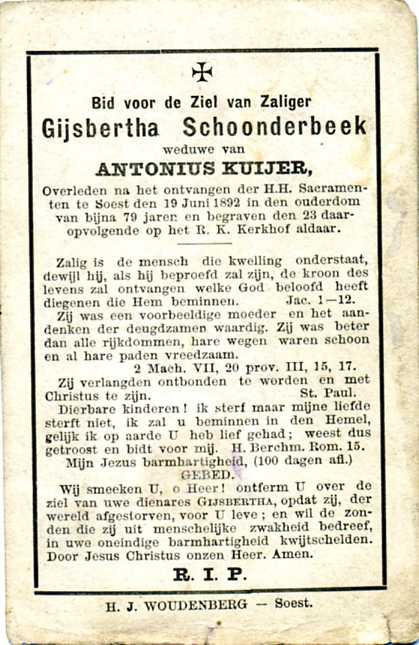 Na deze opmerkingen doen de comparanten als nu volgens de massa des gemeenschappelijken boedels van den overleden Teunis Pieterse Kuijer en zijne nagelatene weduwe de comparante Gijsbertje Schoonderbeek vervolgens de nalatenschap van eerst gemelden, met eene uitrekening van het aandeel ieder der partijen in het zuiver overschot daarvan competerende en eindelijk de scheiding en verdeeling zelve, alles in voege en manieren als volgt: Het extract van de akte geeft daarna een beschrijving van hetgeen aan Hendrik Butselaar, echtgenoot van Rijkje Kuijer wordt toebedeeld. Hij krijgt bijna 2 hectare weiland in Baarn. Dat is een deel van "de vaste goederen behoorend tot de particulieren nalatenschap van den overledene meergenoemde Teunis Pieterse Kuijer, en dat deze daarvan eigenaar is geworden bij acte van scheiding des boedels zijner ouders Peter Kuijer en Evertje Ebbenhorst, den Elfden Augustus achttien honderd twee en vijftig voor den onderteekende notaris en getuigen verleden, geregistreerd overgeschreven ten kantore van de bewaring der hypotheken te Amersfoort den zesden September daaraanvolgende in deel 86, nummer 23." De waarde van het weiland wordt geschat op 1500,- gulden. De "deelbare massa" (zijnde drie/vierde deel) wordt over de zes kinderen verdeeld. Elk krijgt een bedrag van 3487,50 gulden en Gijsbertje behoudt een/vierde deel. De familie (Gijsbertje) was bepaald niet onbemiddeld! De akte wordt verleden op 26 september 1879 "binnen de Gemeente van Soest ten woonhuize van de comparante weduwe Kuijer, in tegenwoordigheid van den Heer Pieter van Bezooijen kantoorbediende en Gerrit van Dijen arbeider, beiden wonende te Baarn". Gijsbertje overlijdt op 19 juni 1892, 78 jaar oud.[9]