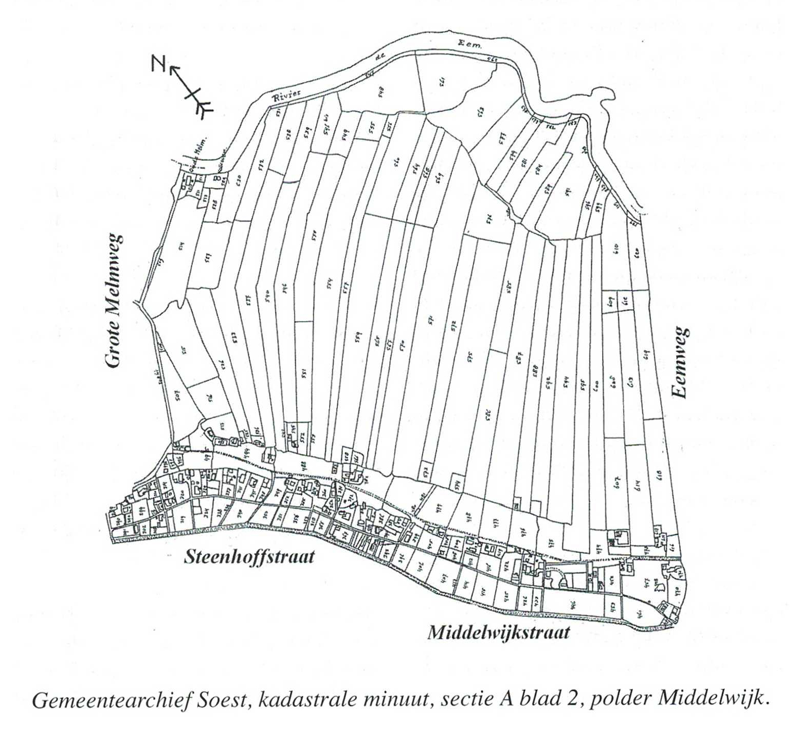 Als voorbeeld van bovenstaande bewering bekijken we hierbij de minuutplan van 1832 van de polder Middelwijk. Op deze kadastrale kaart zien het gebied wat begrensd wordt door de rivier de Eem, Eemweg, Eemstraat, Kerkstraat, Middelwijkstraat, Steenhofstraat en terug via de Grote Melmweg. Duidelijk is te zien dat vanuit de Brink begonnen is met mooie rechte kavels, sommige bereiken in rechte lijnen de Eem. Vreemder is het dat de andere sloten ineens op relatief korte afstand van de Eem eindigden in dwarssloten. Nu is de grondsoort dichter bij de Eem wel anders, bewust laten we even ongewis of het zand of klei is. De verschillen kunnen in een klein gebied groot zijn.