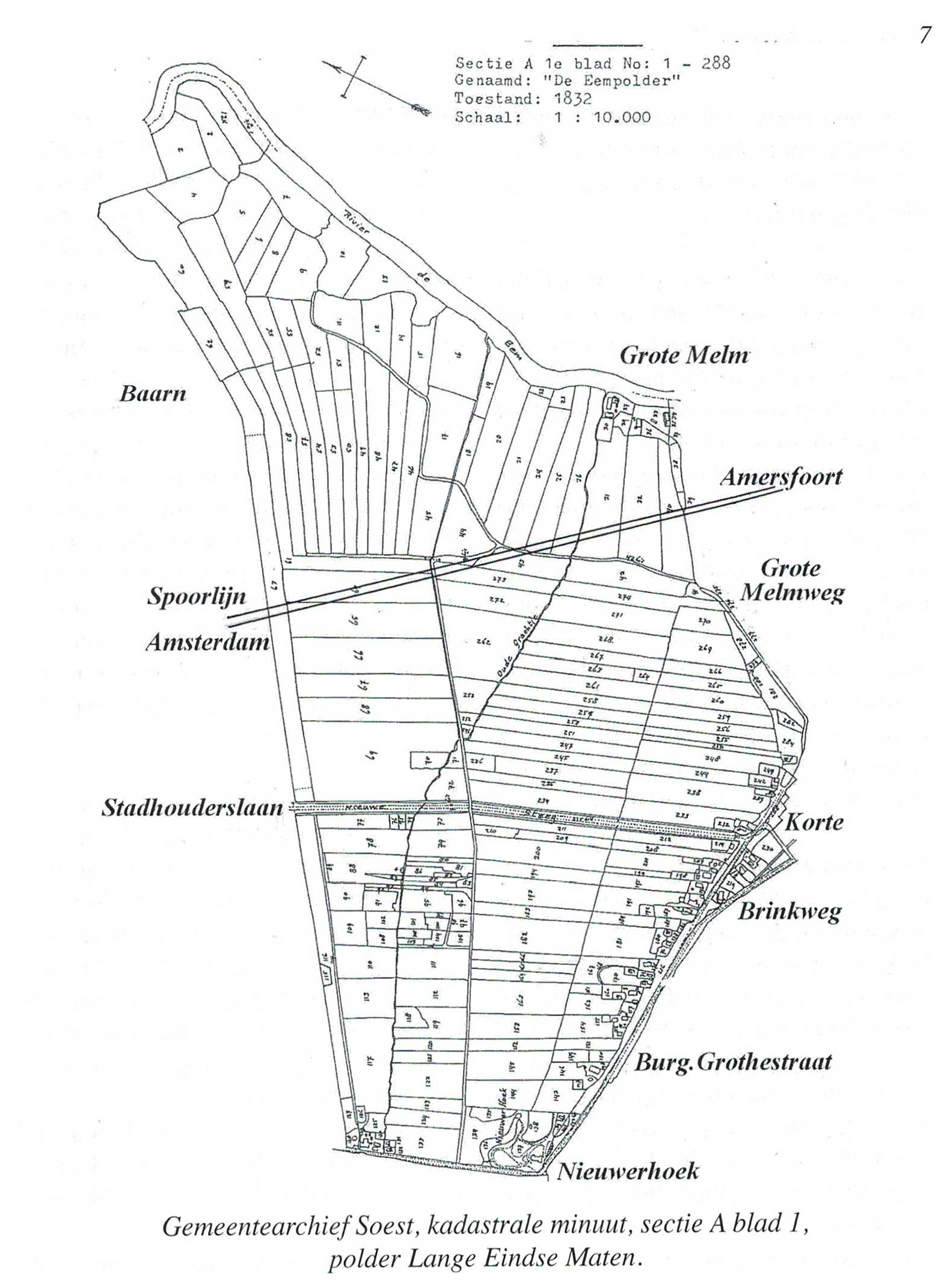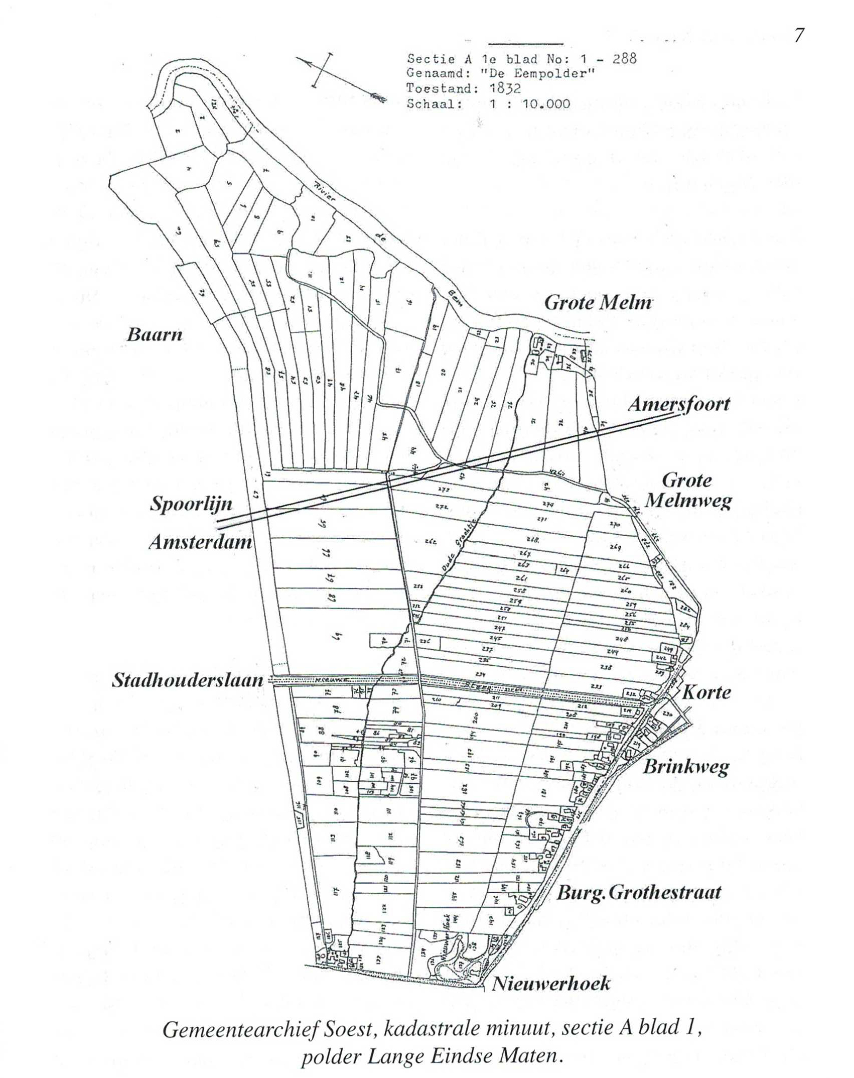 Zou Soest ook vanuit de Eem ontgonnen kunnen zijn? Heden ten dage zijn er nog steeds twee plekken langs de rivier bewoond; de Grote en de Kleine Me1m. Daarmee is nog niet gezegd dat er duizend jaar onafgebroken bewoning langs de rivierzijde is geweest maar voor de boerderijen langs de oostelijke zijde van de Eem in de gemeente Baarn is het wel aangetoond. Qua hoogteligging zal er weinig verschil zitten tussen deze boerderijen in Baarn en deMelmen in Soest, de laatste liggen nog iets verder van de Zuiderzee dus zullen iets minder gevoelig geweest zijn voor de noordwester stormen. Ook aan de hand van het slotenpatroon en daarmee de verkaveling durf ik te stellen dat ook in Soest de ontginning hier en daar vanuit de Eem is opgezet. In Eemnes en Bunschoten zijn de kavels kilometers lang, in Soest stuiten ze al eerder op hogere gronden en kunnen ze hier en daar wel gebotst zijn met andere ontginners.