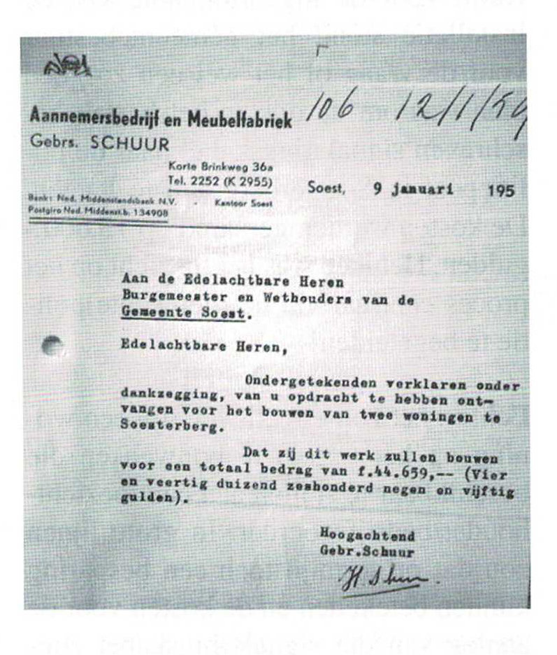Desondanks besloot men toch door te gaan en kreeg het Soester aannemersbedrijf (en meubelfabriek) Gebrs . Schuur (Korte Brinkweg 36a) de opdracht de woningen te bouwen.