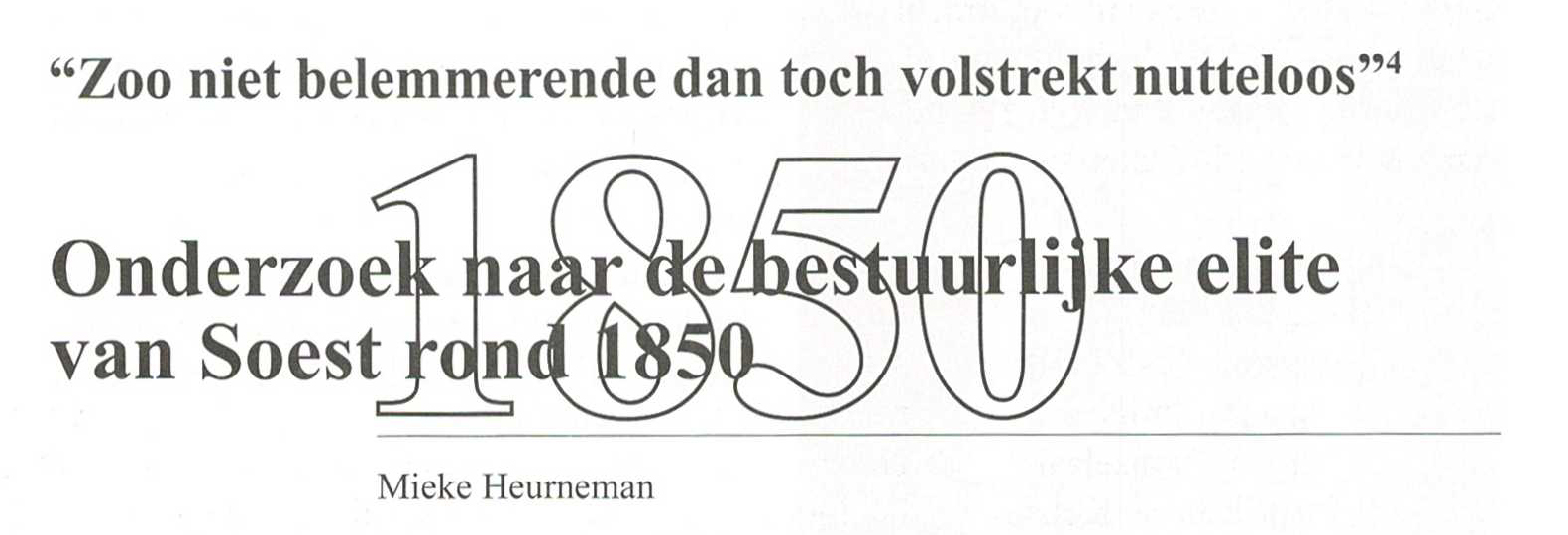 [2] Eerder verschenen artikelen in deze serie: Mieke Heurneman, "Ruste eenigheyd & Welvaaren": onderzoek naar de elite van Soest rond 1750, Van Zoys tot Soest, jrg. 28 (2007), nr. 2, 1-11 en nr. 3, 25-34; Idem, 'Patriotten, Prinsgezinden en Pruisen: onderzoek naar de elite van Soest rond 1787, Van Zoys tot Soest, jrg. 29 (2008), nr. 1, 1-14 en nr. 2, 1-11; Idem, "t Vrije volk van Zoest': Bataafse Revolutie in Soest, 1795-1802', Van Zoys tot Soest, jrg. 29 (2009), nr. 4, 1-14 en jrg 30 (2009), nr. 1, 1-16; Idem, "Rondborstig hunne stem tot goed of afkeuring te geven". Onderzoek naar de bestuurlijke elite van Soest rond 1813', Van Zoys tot Soest, jrg. 31 (2011), nr. 4, 1-9 en jrg. 32 (2011), nr. 1, 3-13.