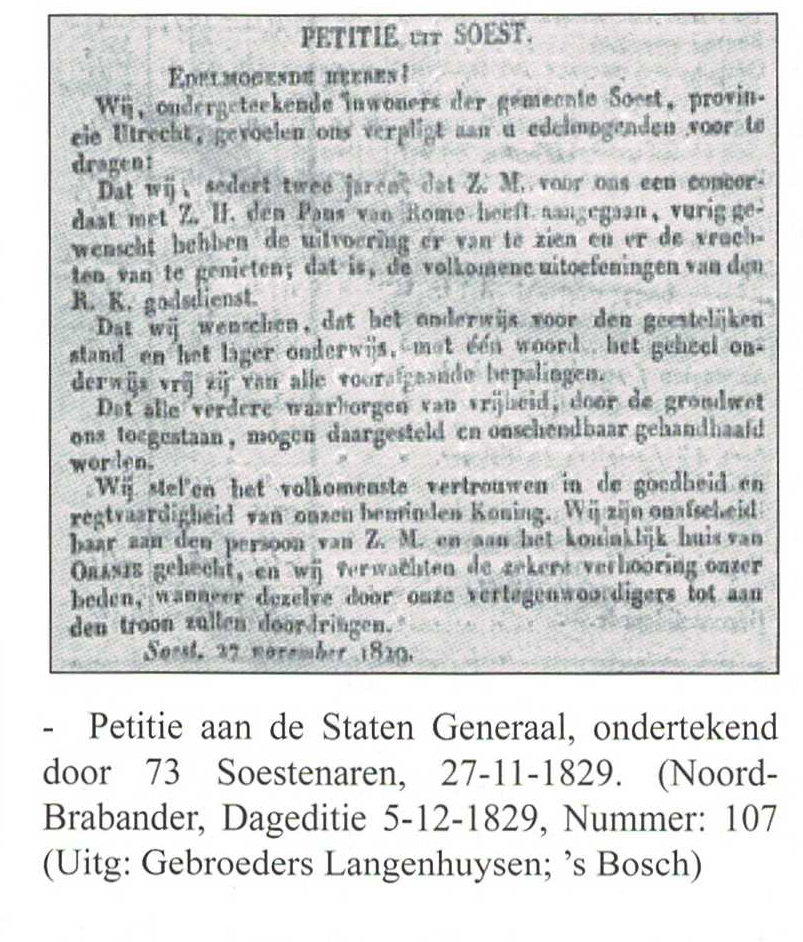 [7] Met dank aan Gérard Derks, die de Soester petitie opspoorde in de Noord-Brabander, Dageditie 5-12-1829, Nummer: 107 (Uitgever: Gebroeders Langenhuysen; 's Bosch) en een bericht over petities uit andere gemeenten in de Noord-Brabander, Dageditie: 22.12.1829, Nummer: 114.