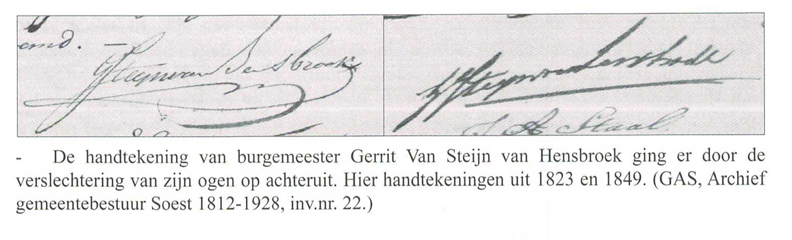 Burgemeester Gerrit van Steijn van Hensbroek, die ook secretaris was, kampte met een verslechterd gezichtsvermogen. Dit was in 1834 al reden geweest om zijn functie als secretaris over te dragen aan zijn zoon Joan Albert. Gerrit van Steijn bleef nog wel vijftien jaar het burgemeestersambt vervullen. Zijn gezondheid ging intussen verder achteruit. Dat bleef ook bij de gemeenteraadsleden en overige inwoners van Soest niet onopgemerkt. Zo werden in de raadsvergadering op 5 maart 1849, waarbij hij zelf niet aanwezig was, twee rekesten aan de koning behandeld, die de gouverneur aan het gemeentebestuur had gestuurd ter kennisgeving en voor advies. Het eerste was behalve door een aantal ingezetenen ondertekend door vier raadsleden: Theunis Kuijer, Peter van den Breemer, Arie van den Hoed en Anthonie van 't Klooster. Zij verzochten om dokter F. Kuijper tot burgemeester te benoemen "op grond van de hooge jaren en ongeschiktheid van den tegenwoordigen burgemeester van Soest". Gerrit van Steijn van Hensbroek werd op de dag van de vergadering namelijk tachtig jaar. Het tweede rekest was ingediend door P. Gallenkamp Pels te Amersfoort, die zelf solliciteerde "om bij eene eventuële vacature als burgemeester der gemeente in aanmerking te mogen komen". Na overleg besloot de gemeenteraad met zes stemmen tegen één dat er op dit moment geen reden was om de burgemeester uit zijn functie te ontheffen. De notulen werden ondertekend door J.A. Staal, J.P. Schouten en H. Fluijt, met daarbij de aantekening: "De leden P. van den Breemer, Arie van den Hoed en Anthonie van Klooster hebben verzocht, hoezeer hunne vollen toestemming tot het bovenstaande gegeven hebbende, om van den teekening bevrijd te blijven". Theunis Kuijer wordt hier niet genoemd. Hij zal de enige tegenstemmer zijn geweest." Op de laatste dag van dat jaar (1849) kwam burgemeester Gerrit van Steijn van Hensbroek zelf met het verlossende woord. Op eigen verzoek had hij van de koning eervol ontslag gekregen. Zo kwam er na ruim 36 jaar een eind aan zijn burgemeesterschap.
