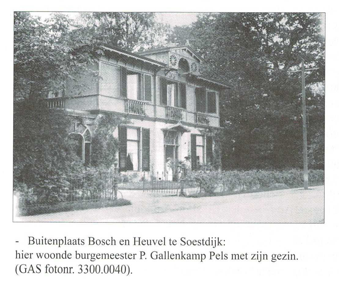 [20] GAS, Bevolkingsregister 1850-1860, boekdeel 1, bladnr. 11; 1861-1879, boekdeel 1, bladnr. 14. In het manuscript van ds. J.J. Bos staat ten onrechte dat Gallenkamp Pels Bosch en Heuvel in 1852 kocht (http://www.oudsoest.nl/lay/media/manuscript/1065 manuscript.pdf), maar in 1853 was Karel Lodewijk Harger nog eigenaar (vriendelijke mededeling Gérard Derks). Mogelijk heeft Gallenkamp Pels hier eerst als huurder gewoond, voordat hij Bosch en Heuvel kocht.