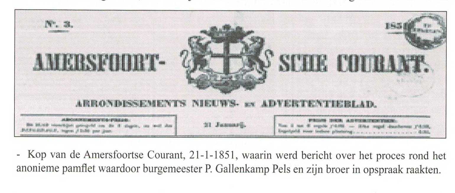 Nadat in september 1850 verkiezingen waren gehouden voor Provinciale Staten, schreef Pieter Gallenkamp Pels samen met zijn broer Christianus Petrus Pels, die burgemeester van Wijk bij Duurstede was, een kritisch en anoniem pamflet over de verkiezingen in het hoofddistrict Amersfoort. [25] Daarin wezen zij vooral op de rechten van de katholieken. Op 12 oktober 1850 had de politie de gehele voorraad hiervan bij de Amersfoortse boekhandel Jacobs en Meijers in beslag genomen, omdat daarop de naam van de drukker niet was vermeld, wat in die tijd verplicht was. Al snel rees het vermoeden dat zij de auteurs ervan waren. In de Amersfoortsche Courant van 21 januari 1851 werd bericht over de rechtszaak die daarop volgde. In de beklaagdenbank zat W.F. Stramrood, boekdrukker en -handelaar te Wijk bij Duurstede, die de brochure uitgegeven zou hebben. Zelf had Pieter Gallenkamp Pels voorkomen dat hij gerechtelijk werd vervolgd door een boete te betalen. Samen met zijn broer was hij nu als getuige gedagvaard in de zaak tegen Stramrood. Gallenkamp Pels leek de zaak niet erg serieus te nemen. Toen hem tijdens zijn verhoor gevraagd werd naar zijn beroep, wekte hij bij de rechtbank irritatie door te zeggen "dat hij getuige was zonder beroep, maar den post vervulde van Burgemeester van Soest" [26], waarop de president hem terechtwees. Vervolgens weigerde Gallenkamp Pels de eed af te leggen, omdat hij zelf eerder beklaagde was geweest in dezelfde zaak. Wel was hij bereid om inlichtingen te geven. Hij verklaarde niet zeker te weten of Stramrood de brochure had gedrukt, omdat hij nooit contact met de man had gehad. Daarna werd zijn broer ondervraagd. Hoewel ook deze weigerde de eed af te leggen, werd hij daartoe wel verplicht. Hij verklaarde dat Stramrood het pamflet inderdaad op zijn verzoek had gedrukt. Gezien de inhoud ervan had Stramrood geweigerd het pamflet ook uit te geven. Stramrood verklaarde dat Christianus Petrus Pels daarop had gezegd: "Dan werkt gij niet voor het Publiek", waar de auteur van het krantenartikel tussen haakjes ironisch aan toevoegde: "t Is waarlijk wel een gedistingueerd publiek waarvoor de Burgemeesterlijke Gebroeders zich in deze hebben geïnteresseerd!". Stramrood had de gedrukte brochures volgens afspraak bij Pels afgeleverd, die hem had gevraagd om de lettervorm nog even te bewaren voor het geval er extra exemplaren nodig zouden zijn.