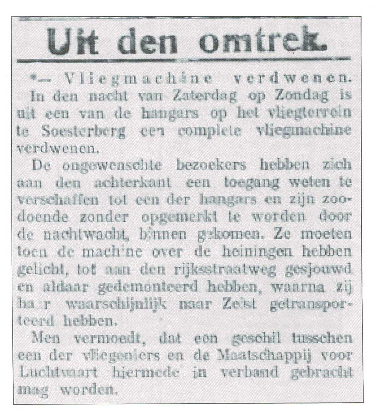 De eigenaar van het toestel Frits Koolhoven was de dader en er waren problemen met de andere partijen die op het vliegkamp actief waren. Er werd geschermd met juridische procedures.