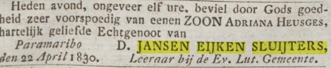 Voor een antwoord op de eerste vraag is een stukje voorgeschiedenis noodzakelijk. In 1756 wordt in het Duitse Wiarden, nabij Hannover, Tjarck Jansz van Eijke geboren. Hij wordt schipper en trouwt in Haarlem met Hester Smit. Bij de doop van zijn kinderen verandert hij de achternaam in Jansen Eijken. Jaren later voegt zijn derde zoon Diederich (geb. 1798) daar de naam Sluijters aan toe, geïnspireerd op de achternaam van zijn opa Euke Johannsen Schlüter. Het levert een unieke combinatie op; iedereen die vandaag de dag de achternaam Jansen Eijken Sluijters draagt is gegarandeerd een nazaat van deze Diederich.