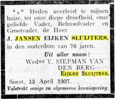 Overlijdensadvertentie van Johannes Jansen Eijken Sluijters in de