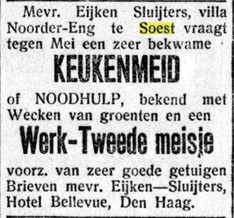Wie wanneer waar woonde blijft een zoektocht. De familie pendelde veel. Zij verbleven op verschillende adressen, zo blijkt uit deze advertentie. Daarin vraagt mevrouw Eijken Sluijters uit Soest om twee hulpen. De brieven mogen naar HotelBellevuein Den Haag.