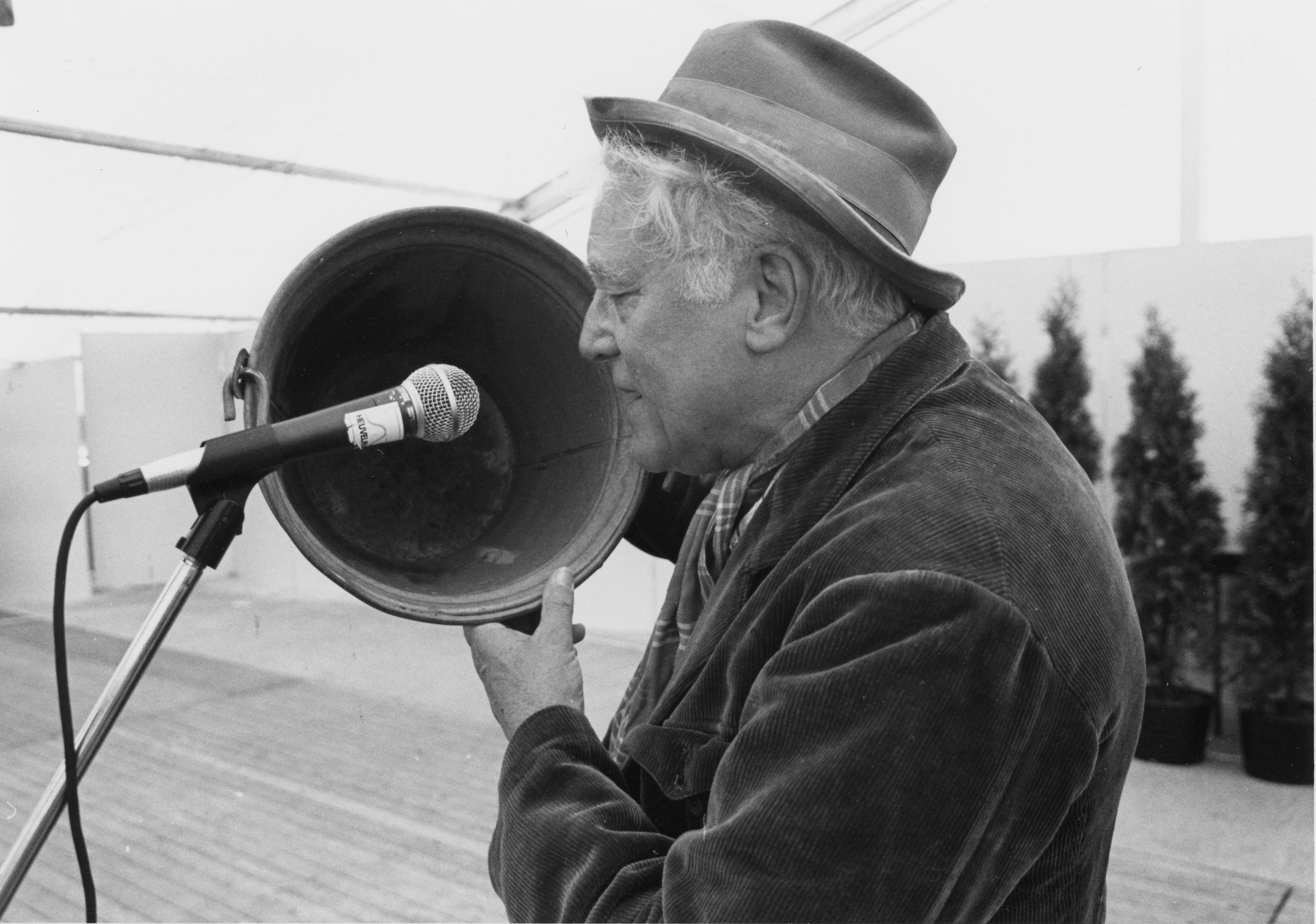 Optreden Piet Ekel op Seniorenmiddag Landjuweel Soest 1987 met zijn beroemde emmer,