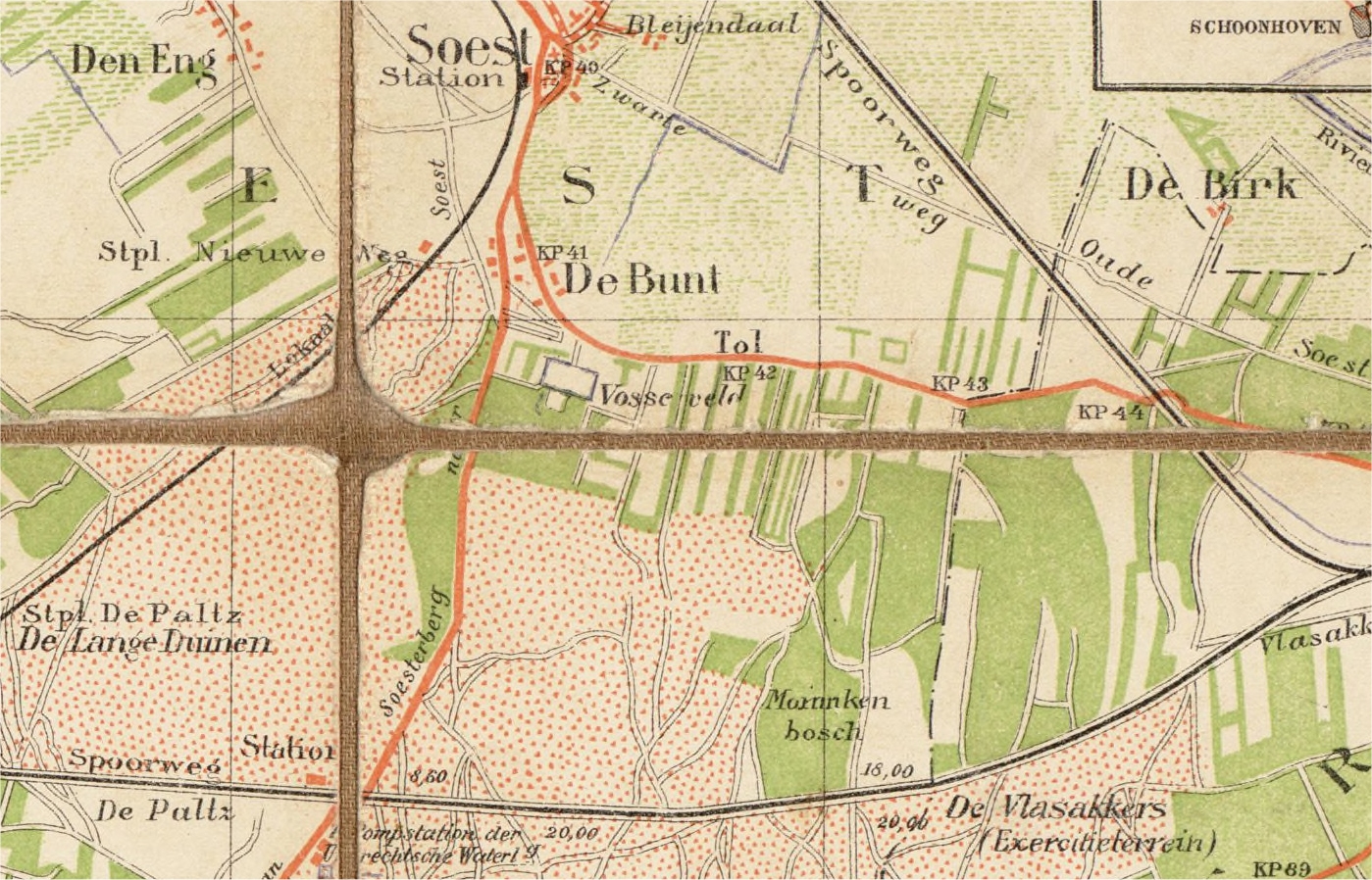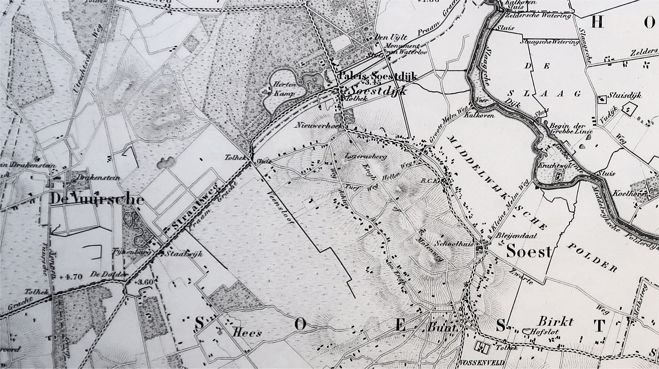 De nieuwe kaart werd onder toezicht van oud kadastermedewerker J.H. Kipssamengesteld en getekend door A. A. Nunnink. De uitgave verscheen in 1850. Hij geeft onder andere inzicht in de ligging en de namen van plaatsen, gehuchten, buurtschappen, polders, wegen, rivieren, vaarten, buitenplaatsen en andere markante gebouwen. Zo kunnen we ons een beeld vormen van de situatie in die tijd in onze gemeente. De volledige kaart bestaat uit vier bladen; Soest staat op blad II (afb. 1).