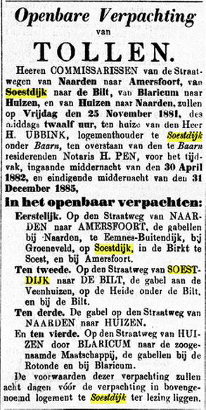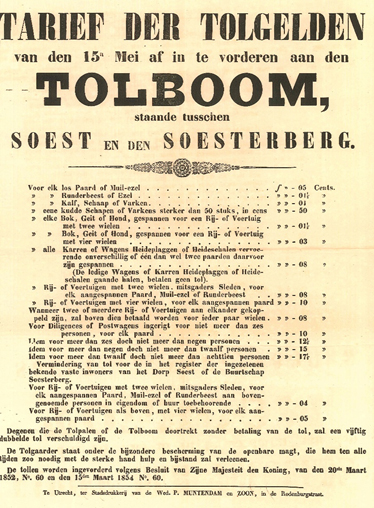 Voor het onderhoud van deze wegen en de aflossing van de lening werd tol (gabel) geheven. Om de tol te kunnen heffen werd een wegversperring gemaakt met een tolboom met daarnaast een huis voor de tolbaas (tolgaarder). Soest kende in de 19e eeuw vier tollen. Twee op de weg Naarden-Amersfoort, op Soestdijk en DeBirk(beide van 1815 tot 1901), een op de weg van Soestdijk naar Baarn, de Veenhuizertol (van 1826 tot 1928) en een op de weg van Soest naar Soesterberg (van 1854 tot 1916). De tolheffing aan drukke doorgaande wegen werd bij openbare inschrijving verpacht en gegund aan de hoogste bieder, telkens voor een periode van drie jaar. Bij minder drukke zijwegen was verpachting niet lonend en werd de tolwachter aangesteld door de wegbeheerder.