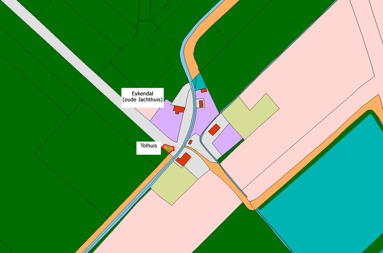 Aan de oostzijde daarvan stond de oude hofstede Eyckendal, eigendom van de Prins van Oranje, toen bewoond door de jachtmeester, gebouwd in 1640, maar later afgebroken (vervangen door nieuw Jachthuis bij de Tol Soestdijk). De schuur ten zuiden van de tol is ook afgebroken, daar is in 1840 de villa Eikenhorst gebouwd, huidig adres Jachthuislaan 55. In de later herbouwde huidige boerderij Eyckendal zijn de oude gevelstenen van de oude hofstede opgenomen, nu aan de Jachthuislaan 68, naast de woning staat de Veenhuizertol op nummer 70.