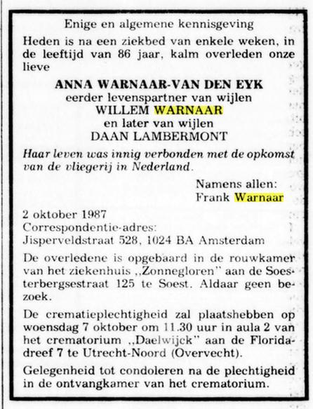 Op de overlijdensadvertentie van Anna Warnaar-Van der Eijk staat de naam Frank Warnaar. Is dit een andere zoon?